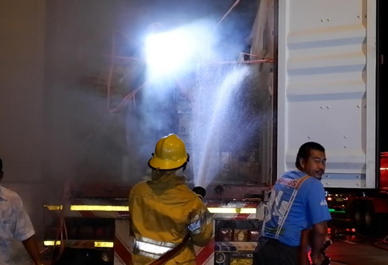นายนิวัฒน์ คนขับรถ เล่าให้ฟัง รับตู้คอนเทนเนอร์มาจากประเทศเขมรบรรทุกน้ำยาปรับผ้านุ่มมาหลายพันลังกำลังจะไปส่งให้ลูกค้าที่ประเทศมาเลเซีย ระหว่างทางเมื่อมาถึงที่เกิดเหตุสังเกตเห็นมีแสงอยู่ท้ายก็จอดลงมาดูก็พบว่าไฟกำลังไหม้ยางล้อหลัง ตกใจมากรีบโทรแจ้งเจ้าหน้าที่ ส่วนสาเหตุต้องรอให้ช่างมาตรวจสอบ คาดว่าน่าจะเกิดจากเบรกชำรุดหรือไม่ลูกปืนล้อแตก ทำให้เกิดการเสียดสีจนเกิดความร้อนจนทำให้ไฟไหม้ โชคดีที่สินค้าที่บรรทุกมาเสียหายบางส่วน