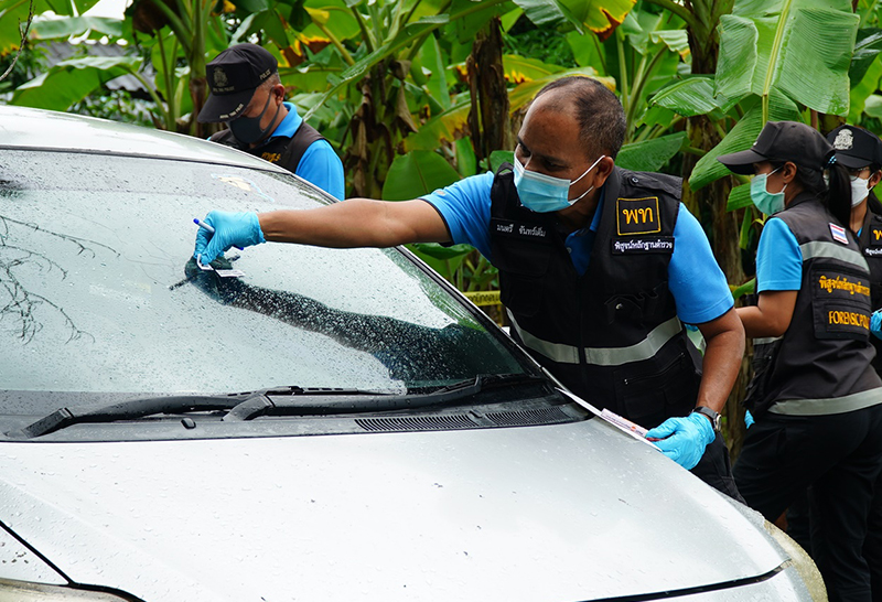 จากการตรวจสอบในเบื้องต้น ตำรวจพบปลอกกระสุนปืนสงครามตกอยู่บริเวณด้านหน้าที่นั่งคนขับจำนวนหนึ่ง ส่วนที่นั่งด้านหลังของรถเก๋งคันดังกล่าว ตร.พบป้ายทะเบียน กง.1042 ตรัง ตั้งอยู่ 2 ป้าย จึงนำไปตรวจสอบว่าเป็นป้ายทะเบียนจริงหรือทะเบียนปลอม ทางด้าน พ.ต.อ.ธนสิทธิ์ จงหวัง ผกก.สภ.ป่าพะยอม จึงแจ้งให้ผู้บังคับบัญชาทราบ และจัดกำลัง เจ้าหน้าที่ตำรวจเข้ารักษารถเก๋งคันดังกล่าวก่อนนำรถมาเก็บไว้ที่ สภ.ป่าพะยอม ไว้เพื่อทำการตรวจสอบ