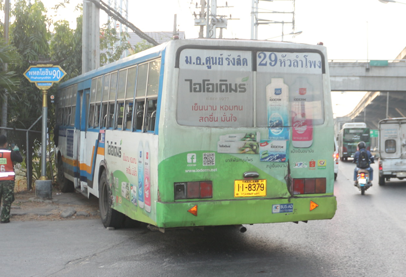 ร.ต.อ.ระพีพงษ์ บุญพัวพันธ์ ร้อยเวรสอบสวนสภ.ประตูน้ำจุฬาลงกรณ์ ได้รับแจ้งมีอุบัติเหตุรถเมล์โดยสารประจำทางชนต้นไม้ข้างทางและมีผู้ได้รับบาดเจ็บหลายราย บริเวณปากซอยพหลโยธิน 90 ถนนพหลโยธินขาเข้าช่องทางคู่ขนาน ต.ประชาธิปัตย์ อ.ธัญบุรี จ.ปทุมธานี จึงไปที่เกิดเหตุพร้อมด้วยรถกู้ชีพเทศบาลนครรังสิต เจ้าหน้าที่มูลนิธิปอเต็กตึ้ง ที่เกิดเหตุพบรถพบรถเมล์ประจำทางสาย29 หมายเลขทะเบียน 11-8379 กรุงเทพมหานคร วิ่งรับ-ส่งผู้โดยสาร มธ.ศูนย์รังสิต หัวลำโพง ชนอยู่กับต้นไม้และป้ายบอกทาง สภาพหน้ารถได้รับความเสียหาย เจ้าหน้าที่กู้ภัยกำลังช่วยเหลือผู้ได้รับบาดเจ็บทั้งหมด11 คนเป็นผู้หญิง10 คนและผู้ชาย1 คน นำส่งโรงพยาบาลเปาโล รังสิต และโรงพยาบาลปทุมเวช ส่วนคนขับรถทราบชื่อนายสุริยะ ชมพูนุช อายุ 54  ปี ยืนรอเจ้าหน้าที่ตำรวจอยู่ในที่เกิดเหตุ จากการสอบถามผู้โดยสารที่นั่งรถมาบอกว่า ตนเองนั่งอยู่ด้านหลังเบาะเดี่ยวเหมือนกับว่าคนขับหักหลบอะไรซักอย่างจึงทำให้รถพุ่งไปชนต้นไม้ข้างทาง คอของตนไปกระแทกกับเหล็กของเบาะนั่งขณะนั้นยังมีผู้โดยสารไม่มากนัก
