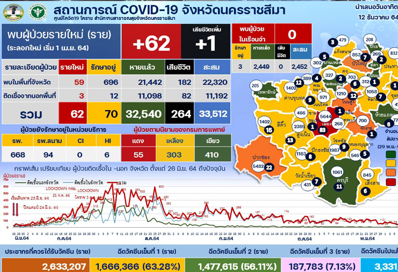 สถานการณ์การแพร่ระบาดของโรคติดเชื้อโควิด 19 ช่วงสัปดาห์ที่ 50 ตั้งแต่วันที่ 29 พฤศจิกายน – 5 ธันวาคม 2564 ใน 32 อำเภอของจังหวัดนครราชสีมา มี 10 อำเภอที่เป็นพื้นที่สีเขียวไม่พบผู้ป่วยโควิด 19 ส่วนอีก 17 อำเภอ เป็นสีเหลือง มีผู้ป่วยโควิด 1-20 ราย ขณะที่ 4 อำเภอเป็นสีส้ม มีผู้ป่วย 21-50 ราย และมี 1 อำเภอ คืออำเภอเมืองนครราชสีมา ที่เป็นสีแดง พบผู้ป่วยโควิด 19 มากกว่า 50 ราย ซึ่งวันนี้ (12 ธันวาคม 2564) ศูนย์โควิด 19 โคราช สำนักงานสาธารณสุขจังหวัดนครราชสีมา ได้อัปเดท พบผู้ติดเชื้อรายใหม่ จำนวน 62 ราย โดยเป็นการติดเชื้อภายในจังหวัด 59 ราย และอีก 3 ราย เป็นการติดเชื้อมาจากนอกจังหวัด