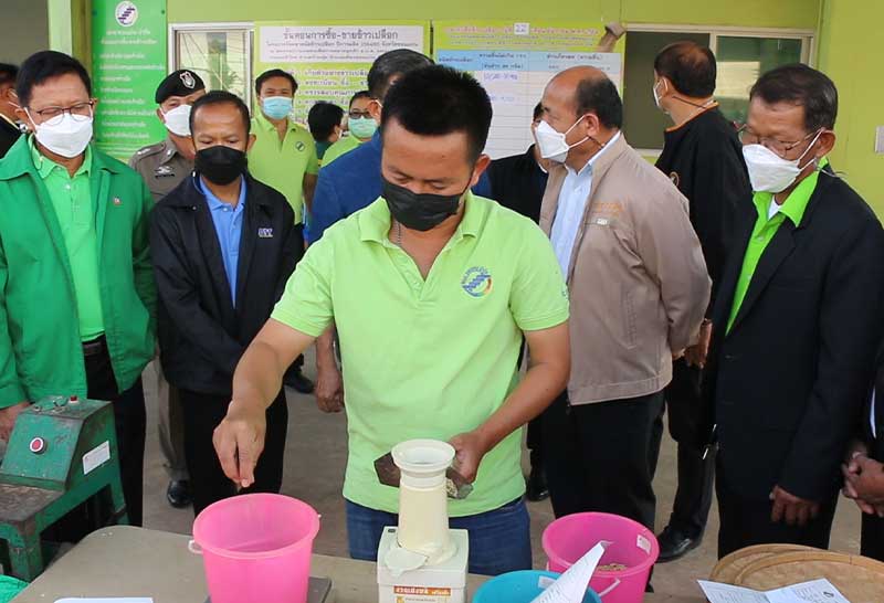 นายสมศักดิ์ จังตระกุล ผวจ.ขอนแก่น กล่าวว่า ขอนแก่น มีโครงสร้างการผลิตข้าวที่แตกต่างจากจังหวัดต่างๆในภาคอีสาน โดยโครงสร้างข้าวส่วนใหญ่ คือข้าวเหนียว คิดเป็น ประมาณ 2 ใน 3 ของพื้นที่การเพาะปลูกข้าวทั้งจังหวัด ซึ่งขณะนี้เข้าสู่ช่วงเก็บเกี่ยวและนำผลผลิตเข้าสู่การรับซื้อข้าว ซึ่งภาครัฐโดยหน่วยงานที่รับผิดชอบทุกฝ่ายได้สนับสนุนให้เกษตรกรได้มีโอกาสเข้าสู่การประกันรายได้ตามนโยบายรัฐบาล รวมทั้งการจัดตลาดนัดข้าวเปลือก เพื่อส่งเสริมด้านราคาและเกิดการแข่งขันด้านตลาด ให้ชาวนามีรายได้เพิ่มมากขึ้น