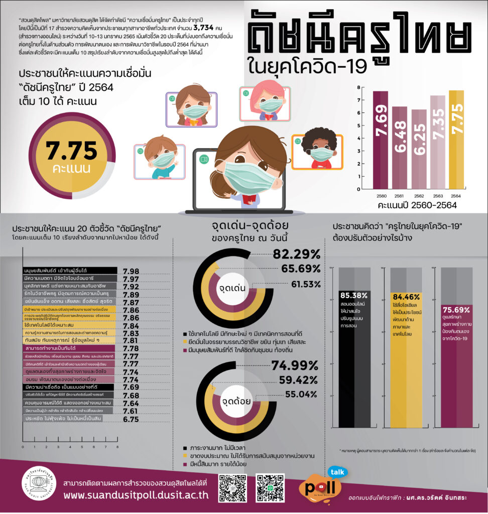 สวนดุสิตโพล มหาวิทยาลัยสวนดุสิต สำรวจความคิดเห็นของประชาชนกลุ่มตัวอย่าง 3,734 คน เรื่อง “ดัชนีครูไทย ปี 2564 ครูไทยในยุค โควิด-19”สำรวจวันที่ 10-13 มกราคม 2565 พบว่า ประชาชนให้คะแนนความเชื่อมั่น “ดัชนีครูไทย” ปี 2564 ดีขึ้นกว่าปีที่แล้ว ภาพรวมคะแนนเต็ม 10 ได้ 7.75 คะแนน