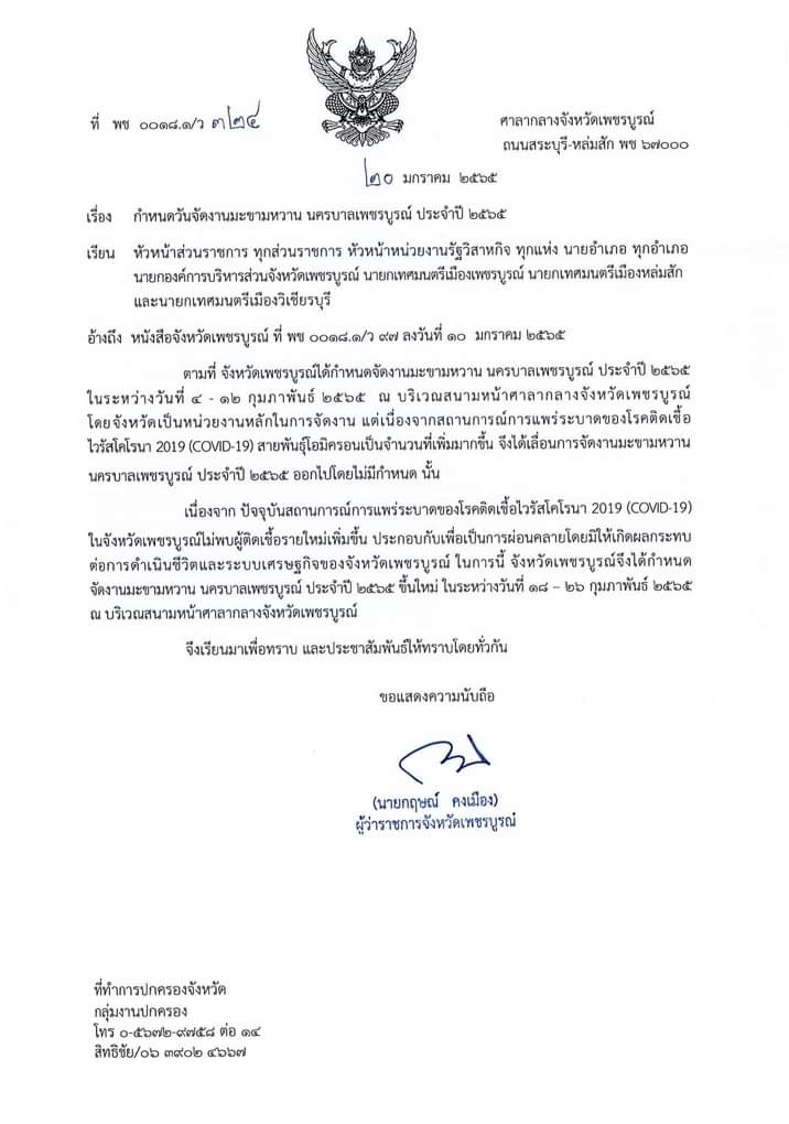 เนื่องจาก ปัจจุบันสถานการณ์การแพร่ระบาดของโรคติดต่อไวรัสโคโรน่า 2019 (covid-19) ในจังหวัดเพชรบูรณ์ไม่พบผู้ติดเชื้อรายใหม่เพิ่มขึ้น ประกอบกับเพื่อเป็นการผ่อนคลายโดยมิให้เกิดผลกระทบต่อการดำเนินชีวิตและระบบเศรษฐกิจของจังหวัดเพชรบูรณ์ ในการนี้จังหวัดเพชรบูรณ์จึงได้กำหนดจัดงานมะขามหวาน นครบาลเพชรบูรณ์ ประจำปี 2565 ขึ้นใหม่ ในระหว่างวันที่ 8 -26 กุมภาพันธ์ 2565 ณบริเวณสนามหน้าศาลากลางจังหวัดเพชรบูรณ์