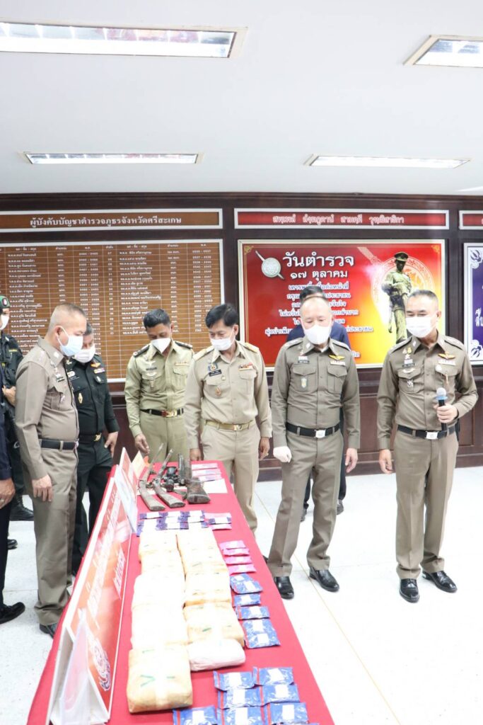 ที่บริเวณด้านล่างอาคารตำรวจภูธร จ.ศรีสะเกษ อ.เมือง จ.ศรีสะเกษ พล.ต.ต.คีรีศักดิ์ ตันตินวะชัย รอง ผบช.ภ.3 พร้อมด้วย นายสำรวย เกษกุล รอง ผวจ.ศรีสะเกษ พล.ต.ต.สันติ เหล่าประทาย ผบก.ภ.จว.ศรีสะเกษ พ.ต.อ.หัสพงศ์ เติมสิริตังคโณบล รอง ผบก.ภ.จว.ศรีสะเกษ พ.ต.อ.ศุภชัย ศักรินพานิชกุล รอง ผบก.ฯ ปรก. ภ.จว.ศรีสะเกษ และเจ้าหน้าที่ที่เกี่ยวข้อง ได้ร่วมกันแถลงผลการจับกุมยาเสพติดรายสำคัญ ในพื้นที่ อ.เมืองศรีสะเกษ อ.ปรางค์กู่ อ.เบญจลักษ์ และ อ.ภูสิงห์