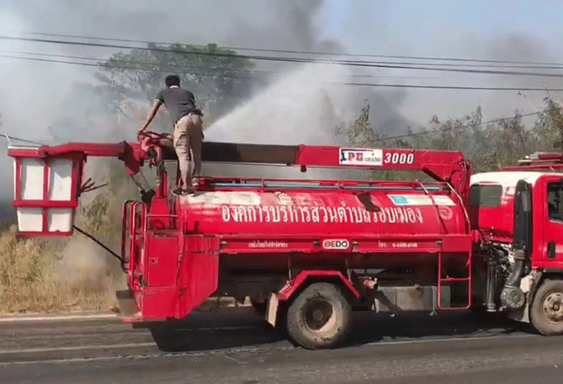 ศูนย์วิทยุมูลนิธิสว่างคุณธรรมสถาน จ.ชัยภูมิ ได้รับแจ้งเหตุเพลิงไหม้บริเวณป่าละเมาะ ด้านหลังหมู่บ้านจัดสรร ถนนเส้นทางสายชัยภูมิ-บ้านเขว้า หลักกิโลเมตรที่252-253 จึงได้ประสานเจ้าหน้าที่หน่วยดับเพลิงเทศบาลตำบลรอบเมือง-เจ้าหน้าที่จากเทศบาลเมืองชัยภูมิ จำนวน 2 คัน ในที่เกิดเป็นป่าละเมาะหรือป่าหญ้าแห้ง โดยไฟป่ากำลังลุกไหม้อย่างรุนแรงห่างจากปั้มน้ำมันและไม่มีทีท่าว่าจะดับได้ง่าย หวั่นสะเก็ดจากกองไฟจะปลิวลุกไหม้ลามเข้าปั้มน้ำมัน ขณะที่เจ้าหน้าที่หน่วยดับเพลิงหาทางเข้าสกัดทางเดินไฟอย่างเร่งด่วน ก่อนที่จะตีวงสกัดไฟที่กำลังลุกลามไหม้หญ้าแห้ง เพื่อไม่ให้ลุกลามเข้าสู่ปั้มน้ำมัน แต่ก็ยังไม่วางใจต้องแบ่งกำลังจุดสกัด ฉีดน้ำเลี้ยงถึง 3 จุด และเจ้าหน้าที่ยังเสี่ยงเดินเท้าเข้าไปเพื่อช่วยสกัดไม่ให้เพลิงลุกลามออกเป็นวงกว้างไปที่อื่น พร้อมทั้งทำแนวกันไฟเพื่อไม่ให้ไฟขยายวงกว้างไปมากกว่านี้ ซึ่งต้องใช้เวลานานกว่า 1-2 ชั่วโมง เพลิงจึงดับลง