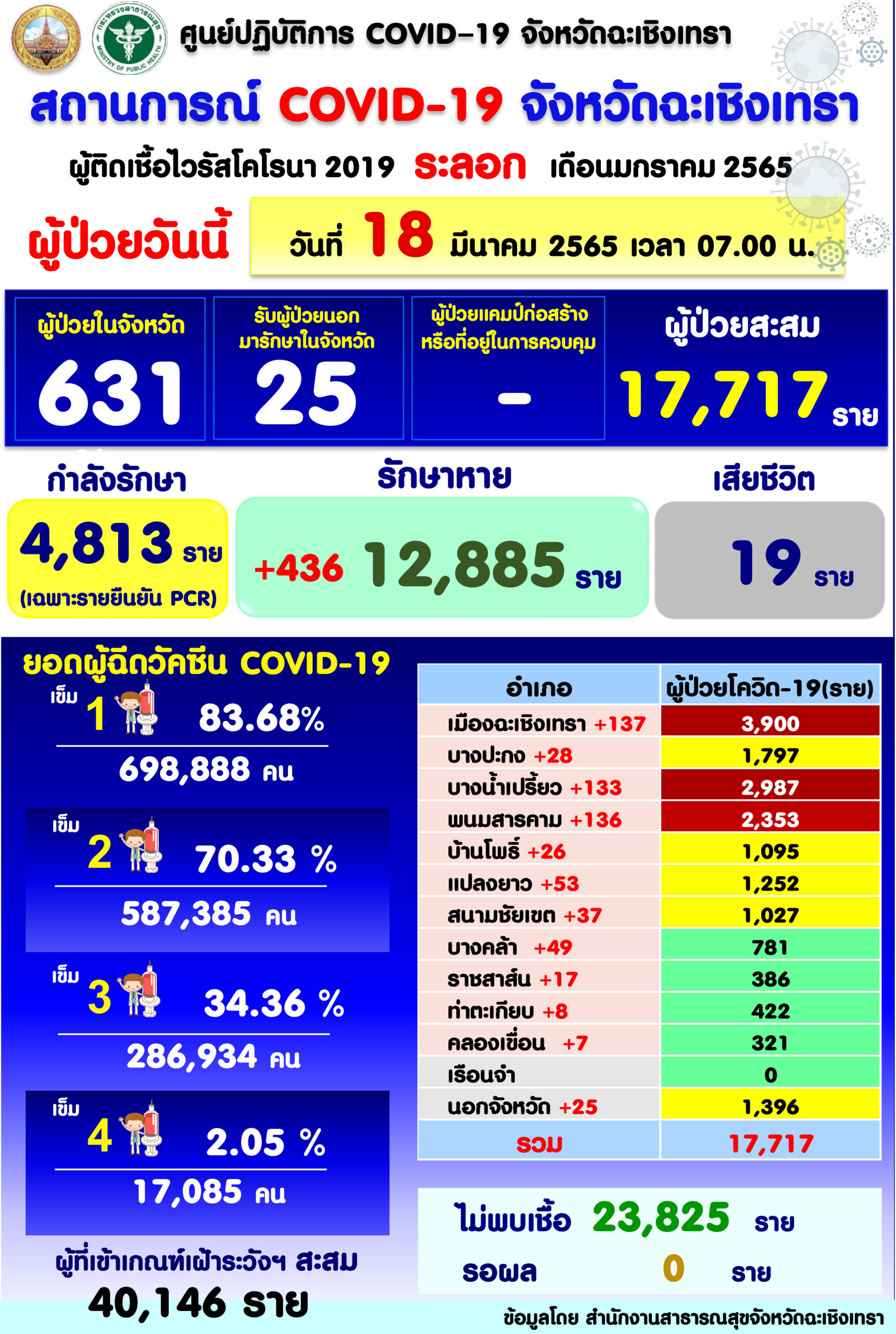 ทำให้ภาพรวมมีผู้ติดเชื้อในพื้นที่นับจากการระบาดระลอกล่าสุดเมื่อวันที่ 1 ม.ค.65 มากถึง 17,717 ราย ภายในช่วงระยะเวลาเพียงแค่ 2 เดือนครึ่ง และมีผู้เสียชีวิตแล้วจำนวน 19 ราย โดยพบการระบาดสูงสุดในเขตพื้นที่ อ.เมืองฉะเชิงเทรา จำนวน 3,900 ราย อ.บางน้ำเปรี้ยว 2,987 ราย อ.พนมสารคาม 2,353 ราย อ.บางปะกง 1,797 ราย อ.แปลงยาว 1,252 ราย อ.บ้านโพธิ์ 1,095 ราย อ.สนามชัยเขต 1,027 ราย อ.บางคล้า 781 ราย อ.ท่าตะเกียบ 422 ราย อ.ราชสาส์น 386 ราย อ.คลองเขื่อน 321 ราย และมีผู้เข้ามารักษาจากภายนอกจังหวัดจำนวน 1,396 ราย ขณะเดียวกันที่ศาลากลางฉะเชิงเทรา หลายหน่วยงานได้มีการปิดกั้นประตูห้ามบุคคลภายนอกเข้า ทั้งการสร้างแนวกั้นที่บริเวณทางเข้าสำนักงาน มีบางหน่วยงานรูดม่านปิดและล็อกประตูทางเข้าไว้ด้วยกุญแจ บางหน่วยงานนำเก้าอี้มาวางขวางกั้นประตูทางเข้าไว้ โดยให้ผู้ที่มาติดต่อราชการนำเอกสารมาวางไว้ยังที่ด้านนอกหน้าสำนักงาน เพื่อรอให้เจ้าหน้าที่ออกมารับเข้าไปเท่านั้น โดยมีบางหน่วยงานถึงขั้นปิดหน่วยงานหรือสำนักงานพร้อมกับขึ้นป้ายบ่งชี้ว่า มีเจ้าหน้าที่หรือข้าราชการในสำนักงานติดเชื้อโควิด 19 ทั้งยังมีรายงานอีกด้วยว่าแม้กระทั่ง นายไมตรี ไตรติลานันท์ ผู้ว่าราชการ จ.ฉะเชิงเทรา ยังต้องกักตนเองอยู่กับจวน เนื่องจากอยู่ในกลุ่มเสี่ยงสูงต่อการติดเชื้อโควิด 19 หลังจากมีข้าราชการในสำนักงานจังหวัดที่เข้ามาปฏิบัติราชการอย่างใกล้ชิดเป็นผู้ติดเชื้อโควิด 19 ด้วย จนต้องใช้วิธีการกล่าวคำต้อนรับและรายงานถึงสถานการณ์น้ำและปัญหาในพื้นที่ ต่อพลเอกประวิตร วงษ์สุวรรณ รองนายกรัฐมนตรี ผ่านทางวิดีโอคอนเฟอเรนซ์ที่ลงพื้นที่เข้ามาตรวจราชการเมื่อวานนี้ (17 มี.ค.65)