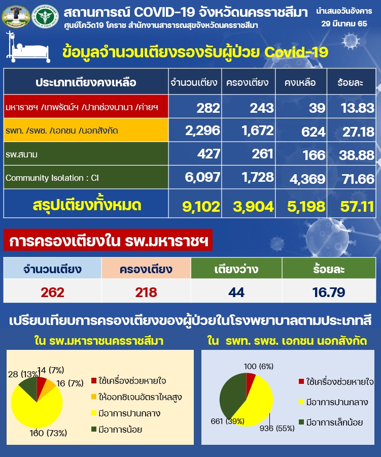 คณะกรรมการควบคุมโรคติดต่อจังหวัดนครราชสีมา ได้รายงานสถานการณ์ผู้ติดเชื้อโควิด-19 รายใหม่ในพื้นที่จังหวัดนครราชสีมา ว่า วันนี้ (29 มีนาคม 2565) พบผู้ติดเชื้อโควิด-19 รายใหม่ ทั้งหมด 1,964 ราย แบ่งเป็นการยืนยันผลตรวจด้วย RT-PCR จำนวน 491 ราย และจากผลการตรวจด้วย ATK อีก 1,473 ราย ทำให้ตอนนี้ จังหวัดนครราชสีมามีผู้ป่วยติดเชื้อโควิด-19 สะสมแล้ว 59,290 ราย โดยรักษาหายแล้ว 33,369 ราย ยังรักษาอยู่ 25,848 ราย และมีผู้เสียชีวิตสะสมแล้ว 73 ราย ซึ่งทางจังหวัดฯ ได้เร่งระดมฉีดวัคซีนให้กับกลุ่มเป้าหมาย จำนวน 2,633,207 คน โดยฉีดเข็ม 1 ไปแล้ว 1,953,311 คน คิดเป็นร้อยละ 74.18 , เข็ม 2 ฉีดได้ 1,688,612 คน คิดเป็นร้อยละ 64.13 , เข็ม 3 กระตุ้นฉีดได้ 672,394 คน คิดเป็นร้อยละ 25.54