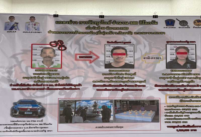 ได้จับกุมไอซ์ 300 กิโลกรัม ได้คาจุดตรวจร่วมด่านถาวรบ้านควนมีด อ.จะนะ ซึ่งขนมากับรถยนต์กระบะยี่ห้อมิตซูบิชิสีบรอนซ์เงิน ใส่ไว้ในลังโฟมสีขาวทำทีเหมือนขนส่งสินค้าปกติ และจับกุม นายประเสริฐ อายุ 53 ปี ชาวต.ทุ่งต่อ อ.ห้วยยอด จ.ตรัง คนขับเอาไว้ได้ จากการสอบสวนผู้ต้องหาให้การว่าตนได้ขับรถขนไอซ์มาจาก เชียงราก จ.ปทุมธานี ไปส่งที่อ.สุไหงโกลก จ.นราธิวาส โดยได้รับค่าจ้างในการขนยาไอซ์ จำนวน 1 แสนบาท