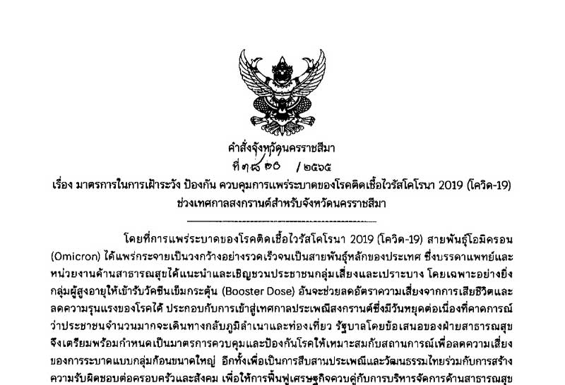 ล่าสุด นายวิเชียร จันทรโณทัย ผู้ว่าราชการจังหวัดนครราชสีมา จึงได้ลงนามในคำสั่งมาตรการเฝ้าระวัง ป้องกัน ควบคุมการแพร่ระบาดของโรคติดเชื้อไวรัสโคโรนา 2019 (โควิด-19) ช่วงเทศกาลสงกรานต์สำหรับจังหวัดนครราชสีมา ตามมติที่ประชุมของคณะกรรมการโรคติดต่อ จ.นครราชสีมา ครั้งที่ 68/2565 เมื่อวันที่ 29 มี.ค. 65 โดยกำหนดมาตรการในการเฝ้าระวังป้องกัน และควบคุมการแพร่ระบาดของโรคติดเชื้อร้ายแรง 6 ข้อ ได้แก่ ข้อ 1 ห้ามจัดกิจกรรมที่มีความเสี่ยง การรวมกลุ่มไม่เกิน 500 คน สำหรับพื้นที่ควบคุมทุกอำเภอ ยกเว้น อ.เมือง อ.ปากช่อง อ.สีคิ้ว อ.วังน้ำเขียว อ.พิมาย อ.เฉลิมพระเกียรติ และ อ.โชคชัย สามารถกระทำได้โดยขออนุญาตพร้อมเสนอมาตรการป้องกันโรคต่อศูนย์ปฏิบัติการควบคุมโรคติดต่อ (ศปก.) ในพื้นที่รับผิดชอบ