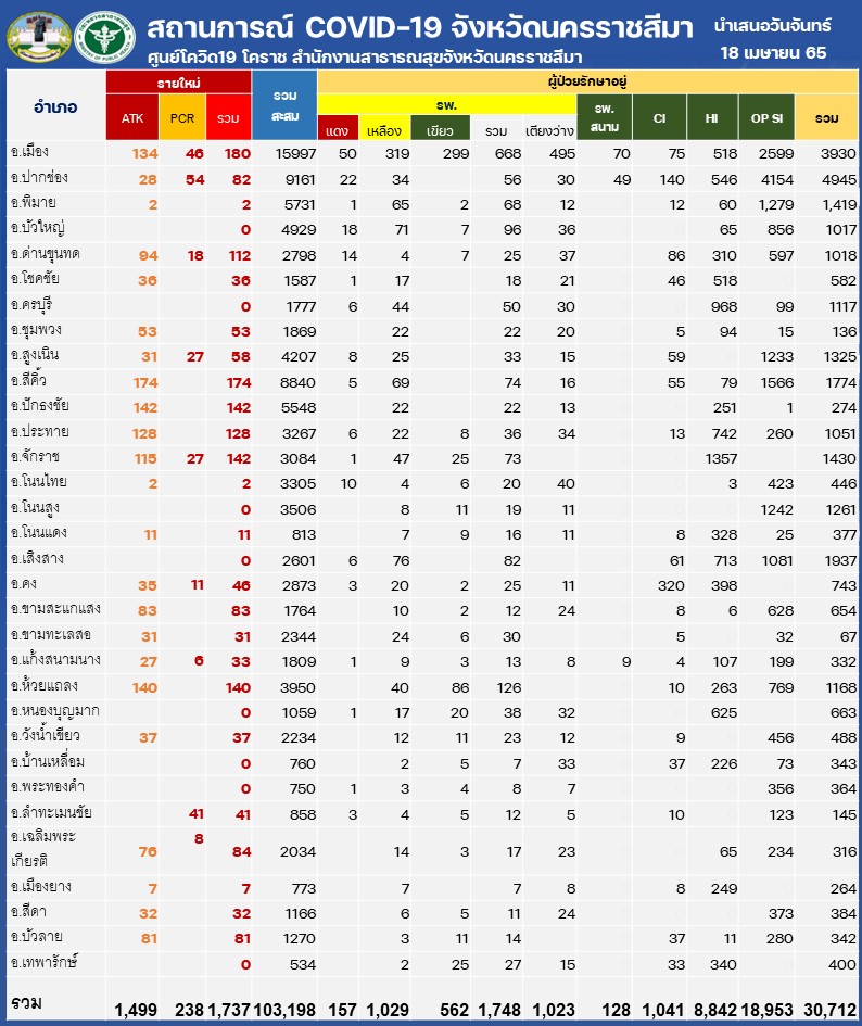 นายวิเชียร จันทรโณทัย ผู้ว่าราชการจังหวัดนครราชสีมา จึงประชาสัมพันธ์เน้นย้ำชาวโคราช และผู้ที่อยู่ในพื้นที่จังหวัด ได้ระมัดระวังตนเองและปฏิบัติตามมาตรการป้องกันโควิด 19 อย่างเคร่งครัด รวมทั้งหมั่นตรวจเช็คอาการตนเอง และหากสงสัยว่าตนเป็นกลุ่มเสี่ยง หรือต้องตรวจคัดกรองตนเองก่อนเริ่มทำงานอีกครั้ง หลังจากหยุดยาวสงกรานต์ไปแล้ว ขอให้หาซื้อชุดตรวจ ATK มาตรวจด้วยตนเองได้ ในขณะเดียวกัน ทางจังหวัดฯ ได้เปิดบริการ “ต้นโพธิ์ โมเดล” ตรวจ ATK ฟรี