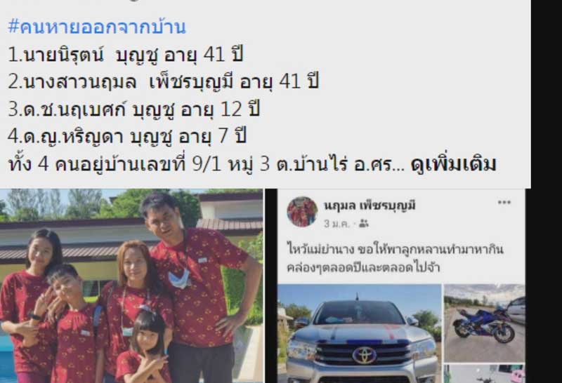 สุโขทัย ตามหา 4 ชีวิตหายออกจากบ้านพร้อมรถนานกว่า10วัน ญาติวอนใครพบเห็นช่วยแจ้งเบาะแส