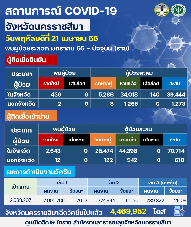 คณะกรรมการโรคติดต่อจังหวัดนครราชสีมา รายงานสถานการณ์การระบาดของไวรัสโควิด-19 ในพื้นที่ จ.นครราชสีมา วันนี้พบว่ามีผู้ติดเชื้อรายใหม่เพิ่มขึ้น จำนวน 3,093 ราย ถือว่าเป็นสถิติสูงสุดใหม่ (นิวไฮ) โดยแบ่งเป็นผลจากการตรวจ ATK จำนวน 2,655 ราย และผลจากการตรวจ RT PCR จำนวน 438 ราย และเสียชีวิตมากถึง 6 ราย เป็นสถิติสูงสุดใหม่เช่นกัน โดยผู้เสียชีวิตทั้ง 6 รายนี้ มีจำนวน 5 ราย ที่ไม่มีประวัติการฉีดวัคซีน และส่วนใหญ่เป็นผู้สูงอายุ ส่งผลให้ตั้งแต่เดือนมกราคม ถึงปัจจุบัน มีผู้ป่วยสะสมแล้ว จำนวน 112,354 ราย รักษาอยู่ จำนวน 30,890 ราย รักษาหายแล้ว จำนวน 81,324 ราย และเสียชีวิต จำนวน 140 ราย คิดเป็นอัตราส่วนผู้เสียชีวิต 0.12% ของผู้ป่วยทั้งหมด
