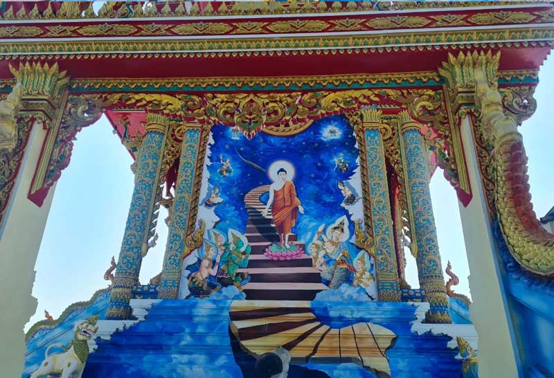 ส่วนที่ประตูด้านซ้ายของโบสถ์ เป็นรูปปั้นยักษ์นั่งหลับด้วยท่าชันเข่าเช่นกัน ที่ข้อมือด้านซ้ายสวมนาฬิกา 2 เรือน พร้อมติดป้ายที่นาฬิกา ว่า “ยืมเพื่อน” ขณะที่มือด้านซ้ายถือโทรศัพท์มือถือ ทั้งนี้ เพื่อเป็นกุศโลบาย และเป็นปริศนาธรรมให้กับคนที่เดินทางมาทำบุญที่วัด โดยยักษ์ที่นั่งหลับ ก็เปรียบเสมือนกับคนเราทุกคน หากเราไม่ได้ตั้งสติ ก็เหมือนเปิดโอกาสให้กิเลสเข้ามาครอบงำตัวของเราได้ ตามที่เสนอข่าวไปแล้วนั้น