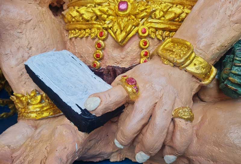 ขณะที่ยักษ์นั่งหลับอีกตน ที่สวมใส่นาฬิกาข้อมือ ก็ให้ช่างทาสีขาวเปลี่ยนให้เป็นกำไลข้อมือ ส่วนอีกมือที่ถือโทรศัพท์มือถือก็เปลี่ยนเป็นพระคัมภีร์แทน เพื่อให้เกิดความสบายใจแก่ทุกฝ่าย และเป็นการยืนยันว่า ทางวัดไม่ได้มีเจตนาทางการเมืองแต่อย่างใด รูปปั้นยักษ์นั่งหลับที่สร้างขึ้นนี้ เป็นเพียงคติธรรมสอนธรรมให้กับประชาชนเท่านั้นเอง