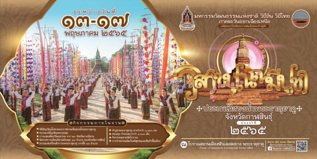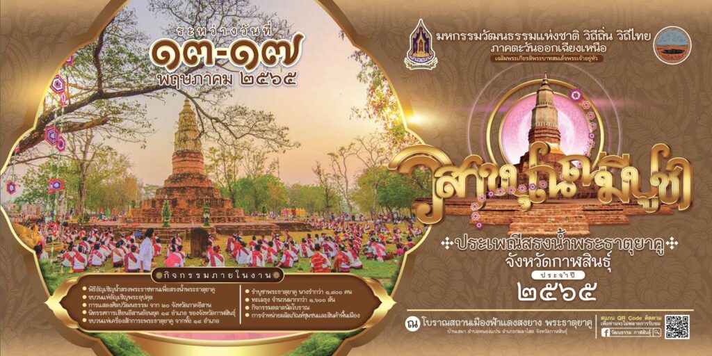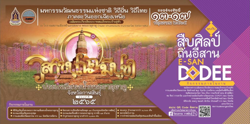 “ทั้งนี้ ในส่วน จ.กาฬสินธุ์ จะได้ประเดิมงานแรกหลังเปิดเมือง ด้วยการจัดงานวิสาขปุณณมี ประเพณีสรงน้ำพระธาตุยาคู ประจำปี 2565 ที่โบราณสถานเมืองฟ้าแดดสงยาง ต.หนองแปน อ.กมลาไสย ซึ่งกำหนดจัดขึ้นในระหว่างวันที่ 13-17 พฤษภาคม 2565 ซึ่งการจัดงานเป็นการบูรณาการร่วมกับกระทรวงวัฒนธรรม ภายใต้งานมหกรรมวัฒนธรรมแห่งชาติ วิถีถิ่น วิถีไทย ภาคตะวันออกเฉียงเหนือ