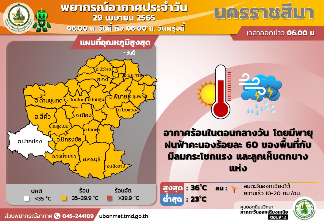 ซึ่งอุตุนิยมวิทยา พยากรณ์ลักษณะอากาศว่า วันนี้จะยังมีพายุฤดูร้อนเกิดขึ้นในพื้นที่ภาคตะวันออกเฉียงเหนือตอนล่าง โดยมีพายุฝนฟ้าคะนองร้อยละ 60 ของพื้นที่ กับมีลมกระโชกแรง และลูกเห็บตกบางแห่ง บริเวณจังหวัดมุกดาหาร ร้อยเอ็ด ยโสธร นครราชสีมา บุรีรัมย์ สุรินทร์ ศรีสะเกษ อำนาจเจริญ และอุบลราชธานี ทางจังหวัดฯ จึงเน้นย้ำไปยัง 32 อำเภอให้เร่งสำรวจความเสียหายเพื่อให้การช่วยเหลือเยียวยาโดยเร็ว พร้อมกับ เฝ้าระวัง และประชาสมพันธ์ประชาชนในแต่ละพื้นที่ให้เตรียมรับมือไว้ด้วย