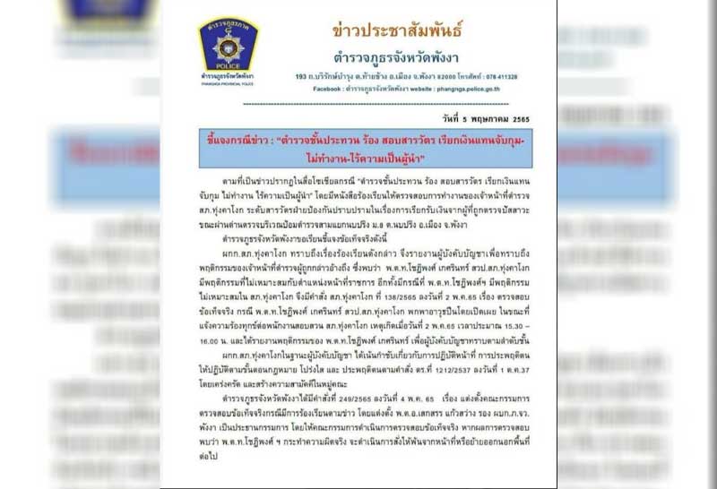 คืบกรณีมีหนังสือร้องเรียนให้ตรวจสอบตำรวจทุ่งคาโงก จ.พังงา หลังเรียกรับเงินแทนจับเสพยาฯ