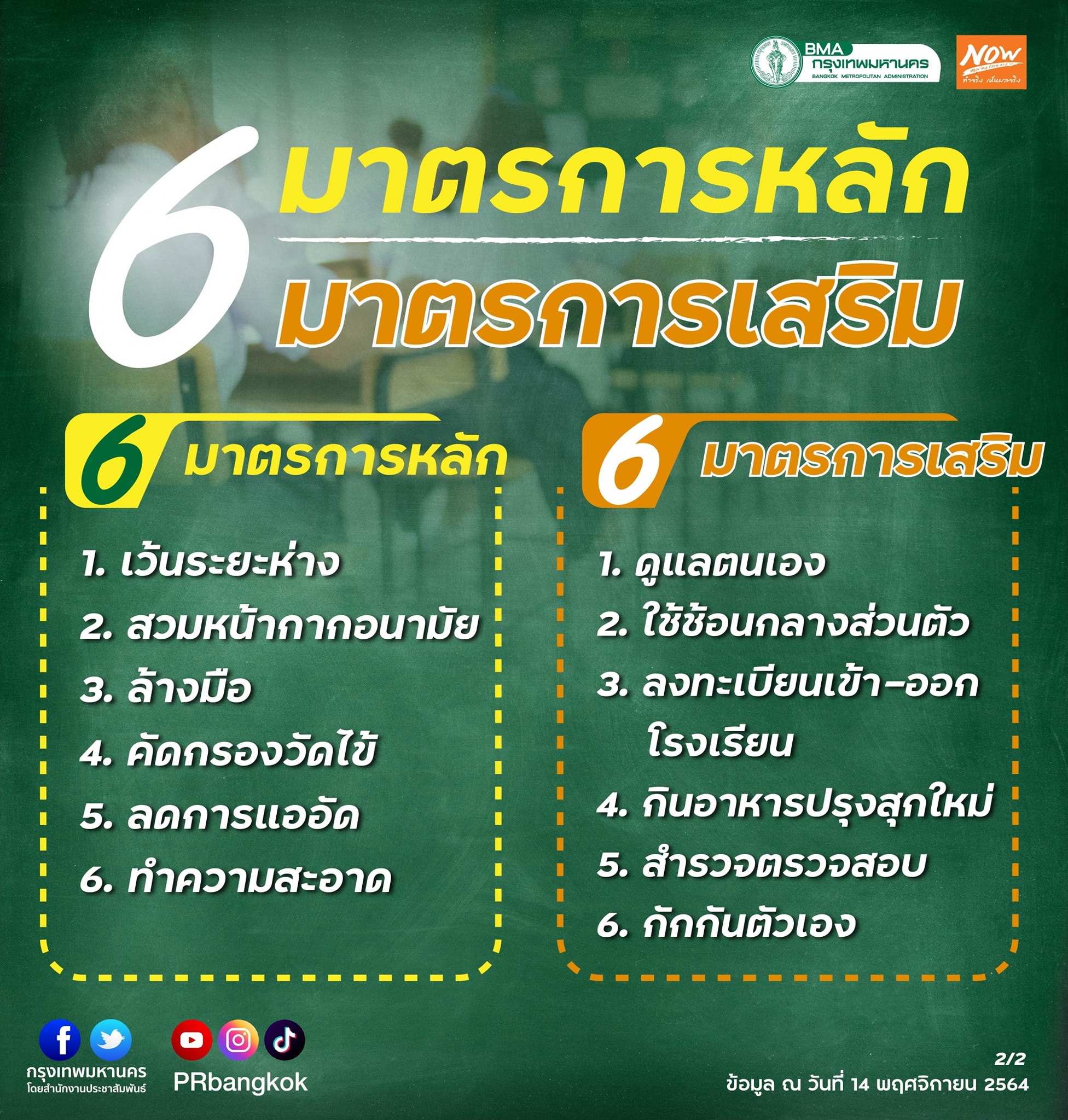 นอกจากนี้ สถานศึกษาต้องปฏิบัติตาม 6 มาตรการหลักสร้างความปลอดภัย ได้แก่ เว้นระยะห่าง สวมหน้ากาก ล้างมือ ตรวจคัดกรอง ลดแออัด ทำความสะอาด ร่วมกับ 6 มาตรการเสริม ในเรื่องการดูแลตนเอง ใช้ช้อนส่วนตัว ทานอาหารปรุงสุกใหม่ ลงทะเบียนเข้า-ออกสถานศึกษา สำรวจตรวจสอบตัวเอง กักกันตนเองเมื่อพบว่าป่วยหรือมีความเสี่ยงติดเชื้อ และปฏิบัติตาม 7 มาตรการเข้ม ได้แก่