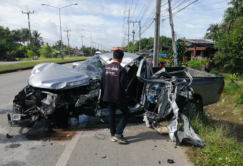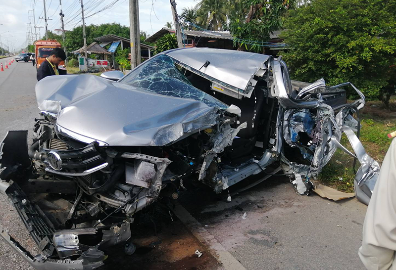 รถกระบะส่งกุ้งชนเสาไฟฟ้าพังยับ คนขับไม่มีแม้รอยขีดข่วน เชื่อบารมีหลวงพ่อทวดช่วยรอดปาฏิหาริย์