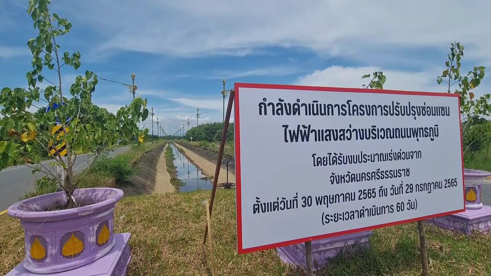 ถนนพุทธภูมิ รอยต่อระหว่างตำบลมะม่วงสองต้น ตำบลโพธิ์เสด็จ และตำบลในเมือง อำเภอเมืองนครศรีธรรมราช มีป้ายประกาศติดตั้งได้เมื่อไม่กี่ชั่วโมงที่ผ่านมา มีข้อความว่า กำลังดำเนินการโครงการปรับปรุงซ่อมแซมไฟฟ้าแสงสว่างบนถนนพุทธภูมิ โดยได้รับงบประมาณเร่งด่วนจากจังหวัดนครศรีธรรมราช ในเวลา 60 วัน ตั้งแต่วันที่ 30 พฤษภาคม 2565 จนถึง 29 กรกฎาคม 2565 แต่ไม่ได้ระบุว่าต้องใช่วงเงินเท่าไหร่ ป้ายนี้เกิดขึ้นหลังจากเมื่อวันเสาร์ที่ 28 พฤษภาคม ที่ผ่านมา นักวิ่งยามเย็นในสวนสาธารณะและบนถนนพุทธภูมิได้รวมตัวนำคบไฟมาจุดให้แสงสว่าง