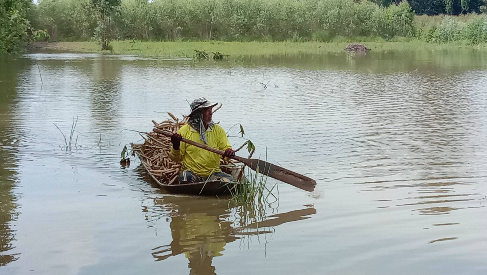 หนีน้ำท่วมชาวไร่มันสำปะหลังโคราช เร่งเก็บผลผลิตใส่เรือท้องแบน หลังปริมาณน้ำลำมาศเพิ่มสูง ท่วมพื้นที่เกษตรเสียหายแล้วนับ 100 ไร่
