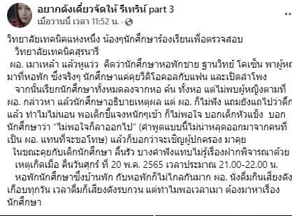 หลังจากที่เพจเฟซบุ๊ก อยากดังเดี๋ยวจัดให้ รีเทริน์ part3 ได้มีการโพสต์คลิปวีดีโอ พร้อมข้อความระบุว่า “วิทยาลัยเทคนิคแห่งหนึ่ง น้องๆนักศึกษาร้องเรียนเพื่อตรวจสอบวิทยาลัยเทคนิคสุรนารี ผอ. เมาเหล้า แล้วหูแว่ว คิดว่านักศึกษาหอพักชาย ฐานวิทย์ พาผู้หญิงมาที่หอพัก ซึ่งจริงๆ นักศึกษาแค่คุยวีดิโอคอลกับแฟน และเปิดลำโพง จากนั้นเรียกนักศึกษาทั้งหมดลงจากหอ ค้นทั้งหอ แต่ไม่พบผู้หญิงตามที่ ผอ. กล่าวหา แล้วนักศึกษาอธิบายเหตุผล แต่ ผอ. ก็ไม่ฟัง แถมยังแถไปว่าดึกแล้ว ทำไมไม่นอน พอเด็กชี้แจงหนักๆเข้า ก็ไม่พอใจ บอกเด็กหัวแข็ง บอกนักศึกษาว่า “ไม่พอใจก็ลาออกไป” (คำพูดแบบนี้ไม่น่าหลุดออกมาจากคนที่เป็น ผอ. แทนที่จะขอโทษ) แล้วก็บอกว่าจะเชิญผู้ปกครอง มาคุยในขณะคุยกับเด็กนักศึกษา ลิ้นรัว บางคำฟังแทบไม่รู้เรื่องฝากพิจารณาด้วย เหตุเกิดเมื่อ คืนวันศุกร์ที่ 20 พ.ค. 2565 เวลาประมาณ 21.00-22.00 น.หอพักนักศึกษาซึ่งบ้านพัก กับหอพักก็ไม่ไกลกันมาก ผอ. นั่งดื่มกินเสียงดังเกือบทุกวัน เวลาดื่มก็เสียงดังรบกวน แต่ทำไมพอเวลาเมา ต้องมาหาเรื่องนักศึกษา”