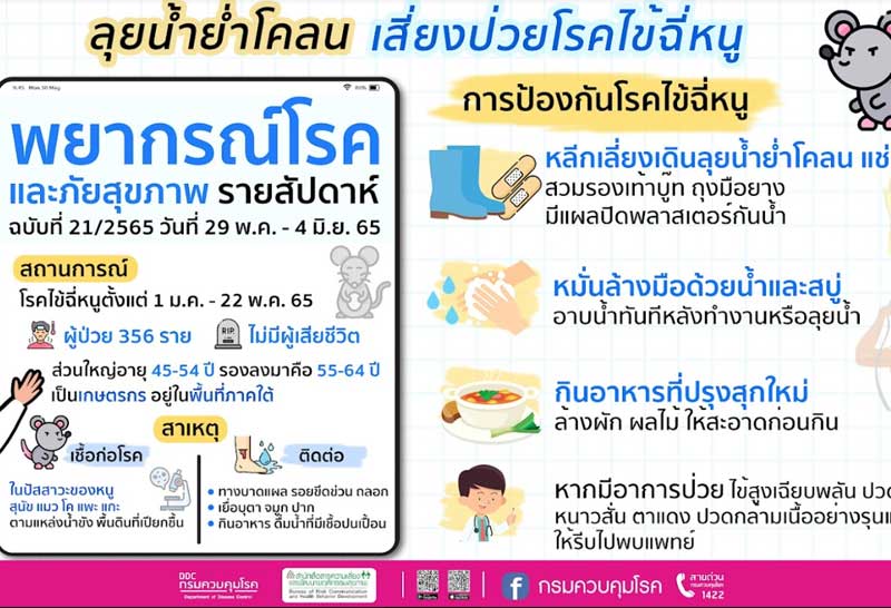 ซึ่งกรมควบคุมโรค ได้พยากรณ์โรคและภัยสุขภาพรายสัปดาห์ ฉบับที่ 21/2565 ประจำสัปดาห์ที่ 22 (วันที่ 29 พฤษภาคม 2565 – 4 มิถุนายน 2565) ว่า จากการเฝ้าระวังสถานการณ์ของโรคเลปโตสไปโรสิสหรือโรคไข้ฉี่หนู