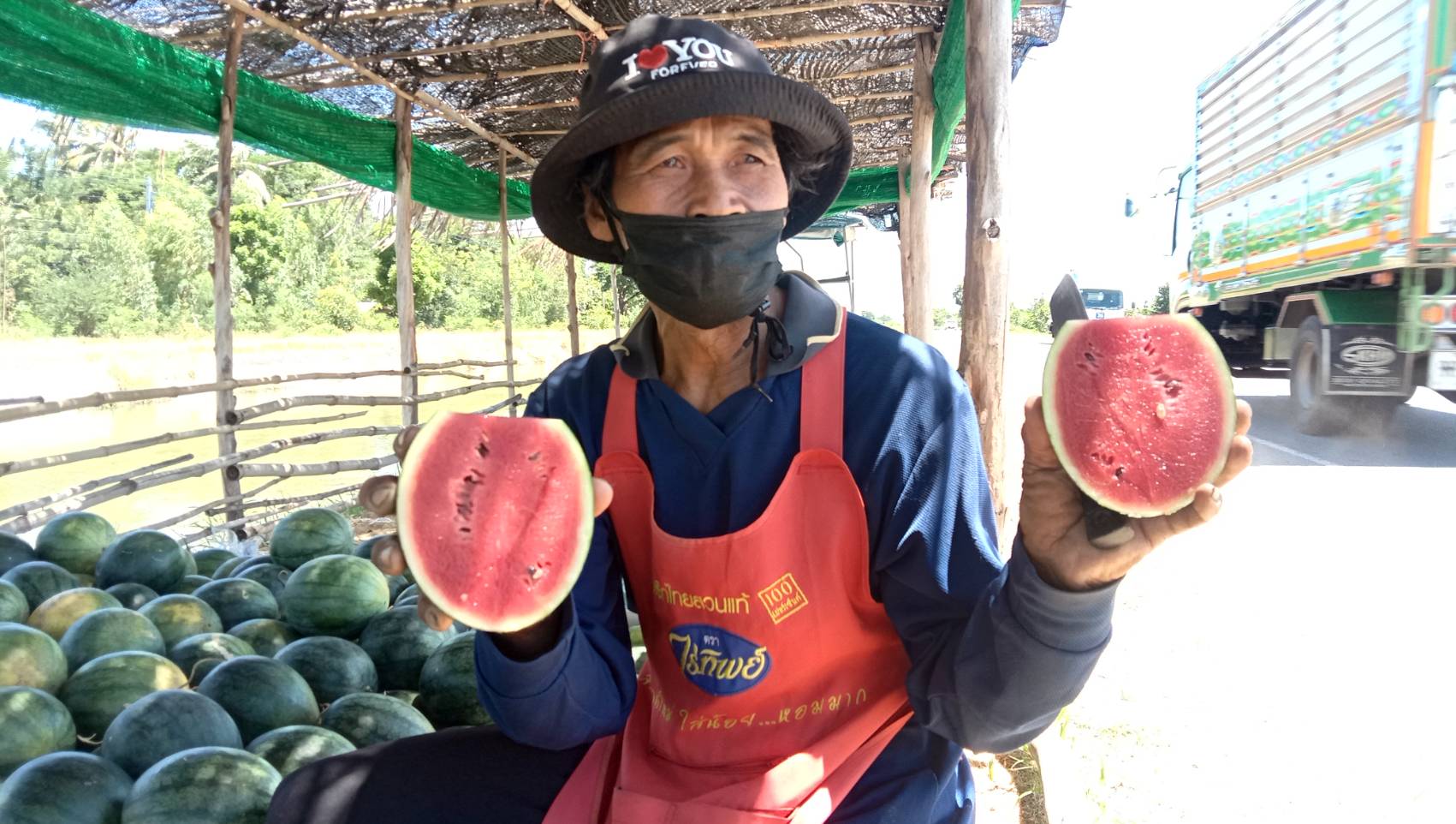 โดยแตงโมที่มีขนาดลูกเล็กสุดเท่ากับไข่เป็ดจะนำมาใส่ถุงขาย ถุงละ 20 บาท ไม่กล้าที่จะขึ้นราคาเพราะกลัวว่าลูกค้าจะหนี จึงใช้วิธีเลือกขนาดของแตงโม มาขายในราคาเท่าเดิม เพื่อเป็นการช่วยเหลือลูกค้า ที่ชอบรับประทานแตงโม ให้มีโอกาสได้ซื้อแตงโมรับประทานในช่วงที่ข้าวของแพงนี้