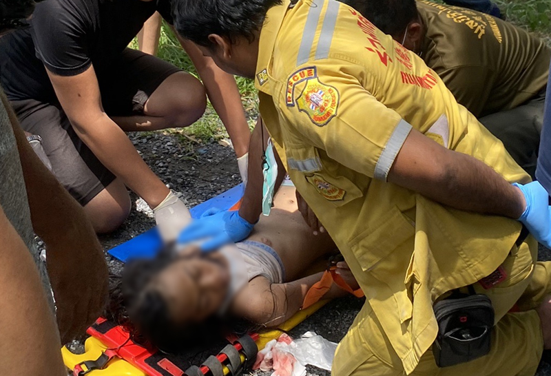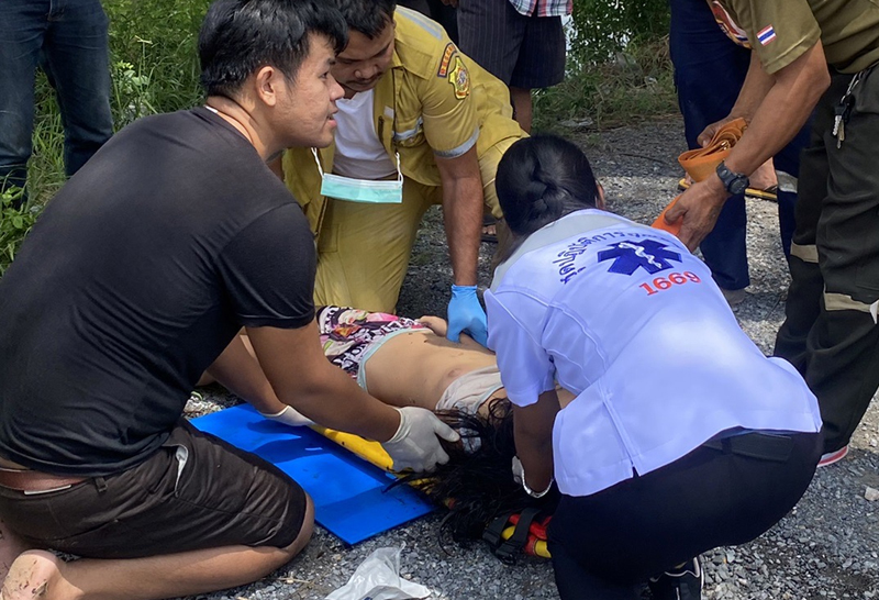 จึงไปตรวจสอบที่เกิดเหตุพร้อมด้วยมูลนิธิร่วมกตัญญู และศูนย์กู้ชีพเทศบาลเมืองสนั่นรักษ์ ที่เกิดพบกับเด็กหญิง 2 คน ไม่ทราบชื่อ อายุประมาณ 12 ปี ที่ชาวบ้านได้ช่วยเหลือนำขึ้นมาจากน้ำบริเวณประตูระบายน้ำคลองสิบ โดยอาสามูลนิธิร่วมกตัญญูและศูนย์กู้ชีพเทศบาลเมืองสนั่นรักษ์ได้ปฐมพยาบาลด้วยการกระตุ้นการเต้นของหัวใจ (CPR) และรีบนำตัวส่ง รพ.หนองเสือ โดยด่วน