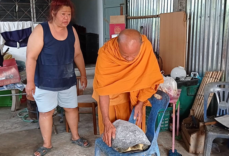 ตนจึงให้สามีจอดรถลงไปอุ้มเอาเต่าขึ้นมาที่รถพ่วงข้างนำมาที่บ้าน ตนเชื่อว่าเขาคงจะมาให้โชคลาภ ทะเบียนรถ 1กต-2635 มหาสารคาม เมื่อชาวบ้านทราบข่าวจึงได้แห่กันมาดู มีทั้งพระสงฆ์ที่อยู่วัดใกล้ๆบ้านก็ออกมาดู