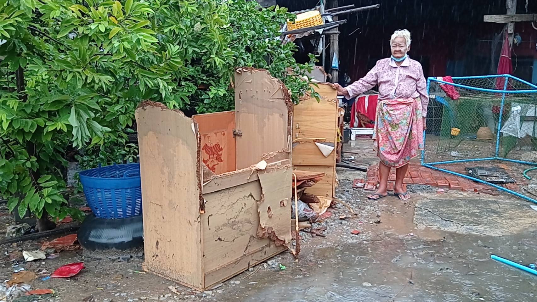 โดยนางตุ้มฯ เจ้าของบ้านกล่าวว่า ช่วงนี้พายุเข้า มีฝนตกตลอดทั้งวันทั้งคืน จึงเป็นเหตุให้น้ำฝนที่ตกลงมาสะสม ระบายไม่ทัน ได้เอ่อไหลเข้าท่วมบ้านของตน เพราะบ้านเป็นพื้นที่ต่ำ ตนอยู่กับหลานตามลำพัง 2 คน พอน้ำไหลเข้าบ้านก็พยายามช่วยกันขนย้ายสิ่งของขึ้นที่สูง ส่วนตู้เสื้อผ้า เตียง หรือข้าวของเครื่องใช้ขนาดใหญ่ก็ยกกันไม่ไหว ต้องปล่อยให้แช่น้ำเสียหาย จึงอยากวอนถึงหน่วยงานต่างๆ ได้โปรดเห็นใจ เข้ามาดูแลช่วยเหลือ และช่วยหาทางแก้ไขปัญหาเป็นการเร่งด่วนด้วย เพราะเดือดร้อนหนักจริงๆ