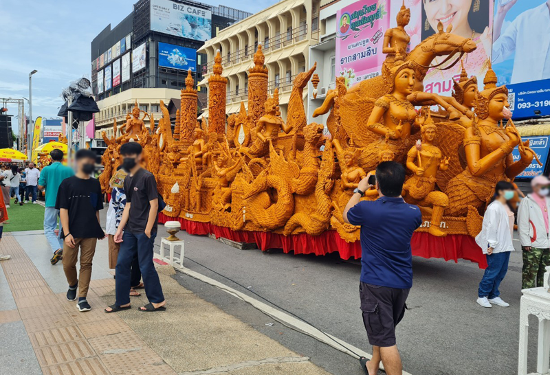 ซึ่งปีนี้ ศบค.ได้ผ่อนคลายมาตรการจึงกลับมาจัดงานอีกครั้ง โดยมีขบวนเทียนพรรษาจากคุ้มวัดชื่อดัง ทั้งในพื้นที่ อ.พิมาย อ.โชคชัย และ อ.โนนสูง ส่งขบวนเทียนพรรษาประเภท ก. และประเภท ข. เดินทางมาร่วมขบวนแห่นับสิบขบวน ซึ่งในช่วงเช้าวันนี้ได้มาจอดไว้บริเวณถนนราชดำเนิน หน้าลานอนุสาวรีย์ท้าวสุรนารี ทำให้มีประชาชน นักท่องเที่ยว จากทุกสารทิศเดินทางมาถ่ายรูปเป็นที่ระลึกกันอย่างคึกคัก