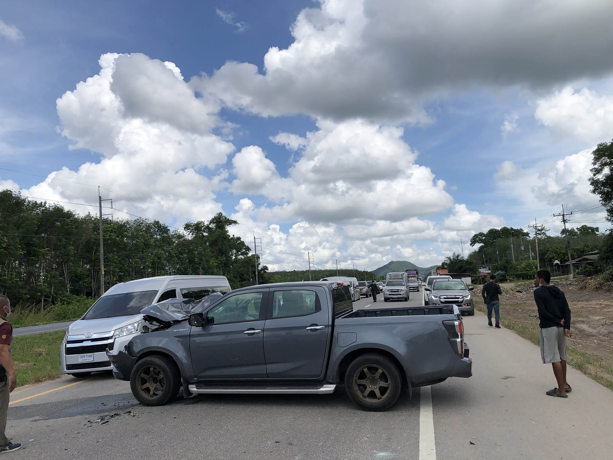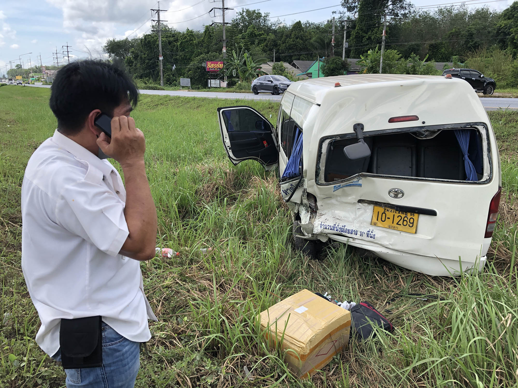 สอบถาม นายชำนาญ คนขับรถตู้ บอกว่า ในช่วงเกิดเหตุกำลังจอดรถอยู่เลนขวา และเปิดไฟกะพริบเป็นสัญญาณเตือนรถคันหลัง เนื่องจากในช่วงนั้นถนนว่าง และด้านหน้ารถเทรลเลอร์กำลังขอทาง เพื่อตีวงเลี้ยวซ้ายเข้าไปยังโรงงานไม้ยางพาราที่อยู่ริมทางแต่ปรากฏว่า จู่ๆได้มีรถยนต์กระบะคันดังกล่าวที่ขับมาด้วยความเร็ว กลับพุ่งชนท้ายรถตู้โดยสารเข้าอย่างจัง จนรถกระเด็นพุ่งลงไปตกอยู่ในร่องกลางถนน และทำให้ผู้โดยสารเต็มคันรถ 10 คน ได้รับบาดเจ็บ และพากันตกใจไปตามๆกัน แต่ยังโชคดีส่วนใหญ่บาดเจ็บไม่หนักมาก และไม่ถึงขั้นเสียชีวิต รวมทั้งยังดีที่ตนมีสติสามารถบังคับรถได้ไม่พลิกคว่ำ