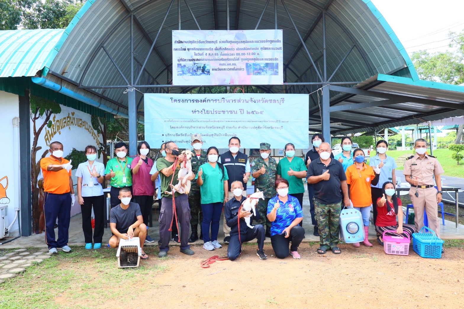 ภายใต้โครงการรณรงค์ป้องกัน ควบคุมโรคพิษสุนัขบ้าและควบคุมจำนวนสุนัขและแมวจังหวัดชลบุรี ประจำปี 2565 โดย องค์การบริหารส่วนจังหวัดชลบุรี ร่วมกับ สำนักงานปศุสัตว์จังหวัดชลบุรี