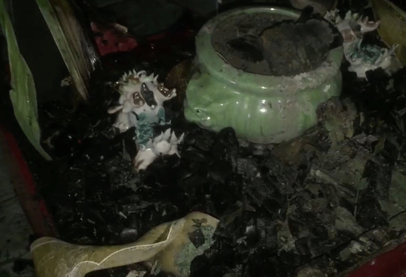 สาเหตุมาจากไฟฟ้าที่ศาลแปะกงช็อต เนื่องจากเสียบไว้ตลอดเวลา ช่วงตรุษจีน ทำให้เกิดไฟลุกไหม้ขึ้นมา แต่ยังโชคดีที่เพื่อนบ้านช่วยดับไว้ได้ทัน ก่อนที่จะลุกลามติดตัวบ้าน รวมทั้งยังช่วยสุนัขชิวาว่า 3 ตัวออกมาได้อย่างปลอดภัย