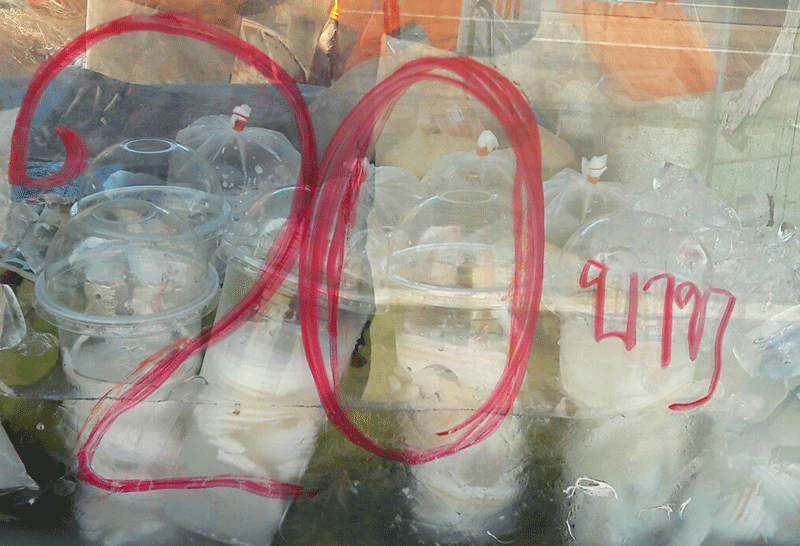 แต่ก่อนขายลูกละ 5 บาท จนปัจจุบันขายยืนพื้นในราคาลูกละ 20 บาท มีทั้งแบบขายเป็นลูก และแบบเฉาะเอาแต่น้ำกับเนื้อมะพร้าวมาใส่แก้วหรือถุง จะขายในราคาเดียวกัน มีลูกค้าทั้งขาจร ขาประจำแวะเวียนมาซื้อไม่ขาดสาย
