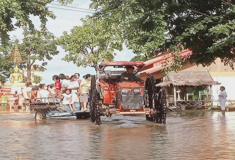 สุโขทัย ญาติโยมขึ้นรถไถลุยน้ำท่วม ขณะส่วนใหญ่มีอาชีพเกษตรกรรม ไปตักบาตรเทโวที่วัดพลายชุมพล
