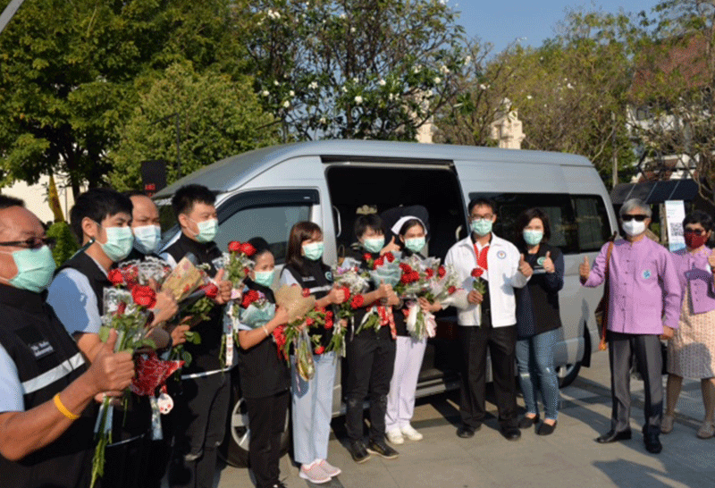 หลังจากนั้น เจ้าหน้าที่สำนักงานสาธารณสุขจังหวัดเชียงใหม่ ญาติ เพื่อนร่วมงาน ประชาชนและสื่อมวลชน จังหวัดเชียงใหม่ ร่วมส่งนักรบชุดขาวจังหวัดเชียงใหม่ ขึ้นรถตู้ โดยได้มีการตั้งแถวและมอบดอกไม้ให้กับนักรบชุดขาวทั้ง 8 ท่าน ซึ่งบรรยากาศเป็นไปด้วยความอบอุ่น ทั้งนี้ ทีมนักรบชุดขาวจังหวัดเชียงใหม่ จะเดินทางถึงจังหวัดสมุทรสาครในช่วงค่ำวันนี้ และพร้อมปฏิบัติหน้าที่ได้ในช่วงวันที่ 15- 21 กุมภาพันธ์ 2564 และหลังจากกลับมาจากการปฏิบัติหน้าที่ตามเป้าหมาย บุคลากรทางการแพทย์ทุกคนจะถูกกักตัว 14 วัน และตรวจหาเชื้อโควิด-19 จนมั่นใจว่าร่างกายปลอดเชื้อ สมบูรณ์ แข็งแรง จึงจะสามารถกลับมาปฏิบัติหน้าที่ได้ตามปกติต่อไป
