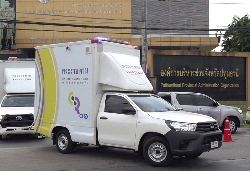 ต่อมาเวลา 13.00 น. นายชัยวัฒน์ ชื่นโกสุม ผู้ว่าราชการจังหวัดปทุมธานี และ พล.ต.ท.คำรณวิทย์ ธูปกระจ่าง นายกองค์การบริหารส่วนจังหวัดปทุมธานี ร่วมปล่อยขบวนรถตรวจโรคติดเชื้อชีวนิรภัย จากสถาบันป้องกันควบคุมโรคเขตเมือง จำนวน 4 คัน ซึ่งได้รับพระมหากรุณาธิคุณจากพระบาทสมเด็จพระเจ้าอยู่หัวและสมเด็จพระนางเจ้าฯ พระบรมราชินี ทรงพระราชทานเพื่อให้องค์การบริหารส่วนจังหวัดปทุมธานี ใช้เป็นห้องปฏิบัติการเคลื่อนที่ในการเก็บ ตัวอย่างโรคติดเชื้อไวรัสโคโรนา 2019 (COVID-19) ให้แก่ประชาชนในพื้นที่ตลาดพรพัฒน์ ตำบลประชาธิปัตย์ อ.ธัญบุรี จ.ปทุมธานี เพื่อมาช่วยดำเนินการคัดกรองร่วมการหน่วยงานที่ทำอยู่ขณะนี้ ที่ตลาดพรพัฒน์ ตำบลประชาธิปัตย์ อำเภอธัญบุรี จังหวัดปทุมธานี ให้มีประสิทธิภาที่คือการปรับปรุงพื้นที่ให้มีประสิทธิภาพให้สูงขึ้น ในการทำงานและป้องกันเชื้ออาจจะกระจายไปติดคนอื่นอีก ปัจจุบันทางทีมแพทย์ได้ตรวจประชาชนภายในตลาดไปแล้วจำนวน 2,122 คน พบว่ามีผู้ติดเชื้อจำนวน 224 คน เป็นคนไทย จำนวน 128 คน และชาวต่างด้าวจำนวน 96 คน