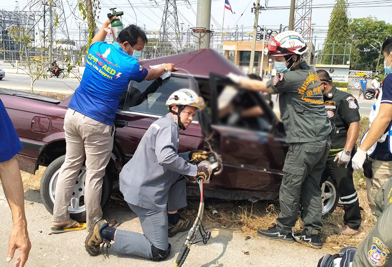 พ.ต.ท.กมล คิดอ่าน สว.(สอบสวน) สภ.เมืองลำปาง พร้อมด้วย จนท.กู้ชีพ.รพ.ค่ายสุรศักดิ์มนตรี และ จนท.สมาคมกู้ภัยลำปาง นำเครื่องมือตัดถ่าง รุดไปยัง ที่เกิดเหตุ บริเวณตรงข้ามโรงไฟฟ้าย่อยปงวัง บ้านปงวัง ถ.ลำปาง-งาว (ขาเข้าเมือง) ต.พิชัย อ.เมืองลำปาง จ.ลำปาง หลังรับแจ้งว่า มีรถยนต์เก๋ง เสียหลักฟาดชนกับเสาไฟฟ้า มีคนเจ็บสาหัส เป็นหญิง 1 ราย