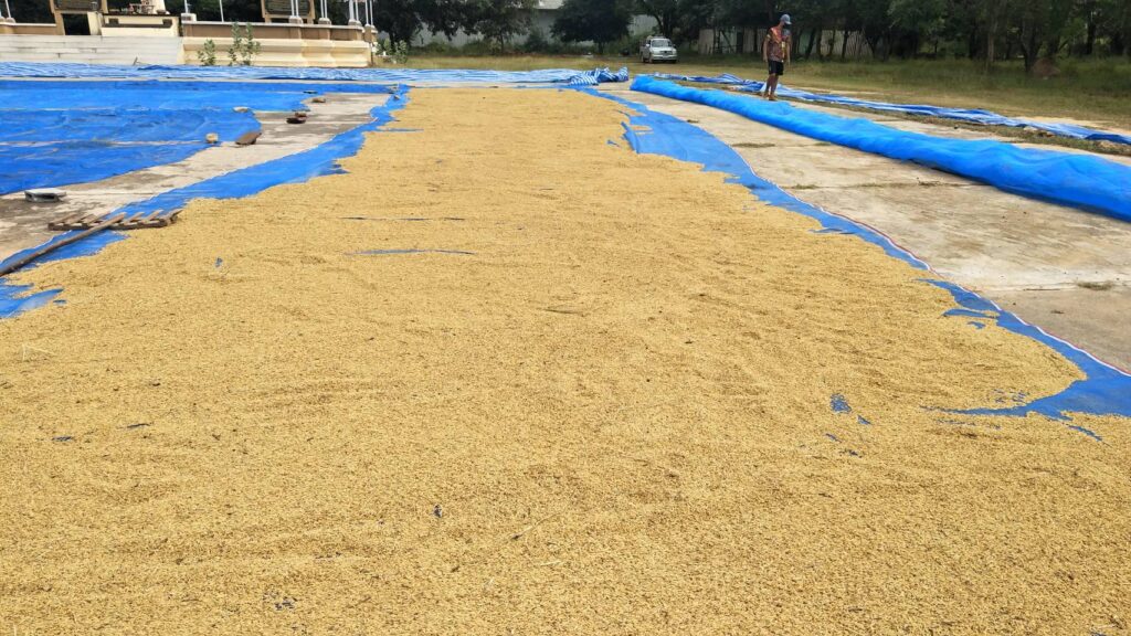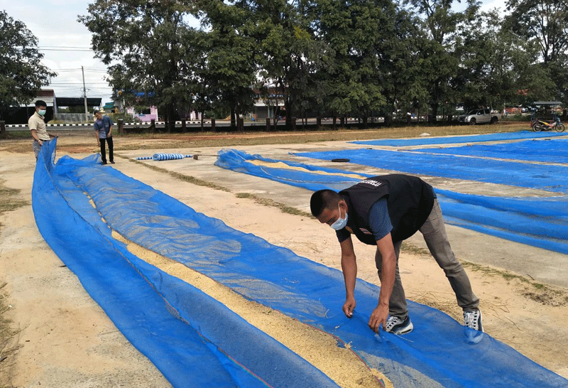 ชาวนาแห่ตากข้าวหน้าลานย่าโมหลังมีฝนตกหวั่นผลผลิตเสียหาย ด้านอำเภอสั่งการให้กำนันผู้ใหญ่บ้านจัดเวรยามเฝ้าป้องกันมิจฉาชีพ
