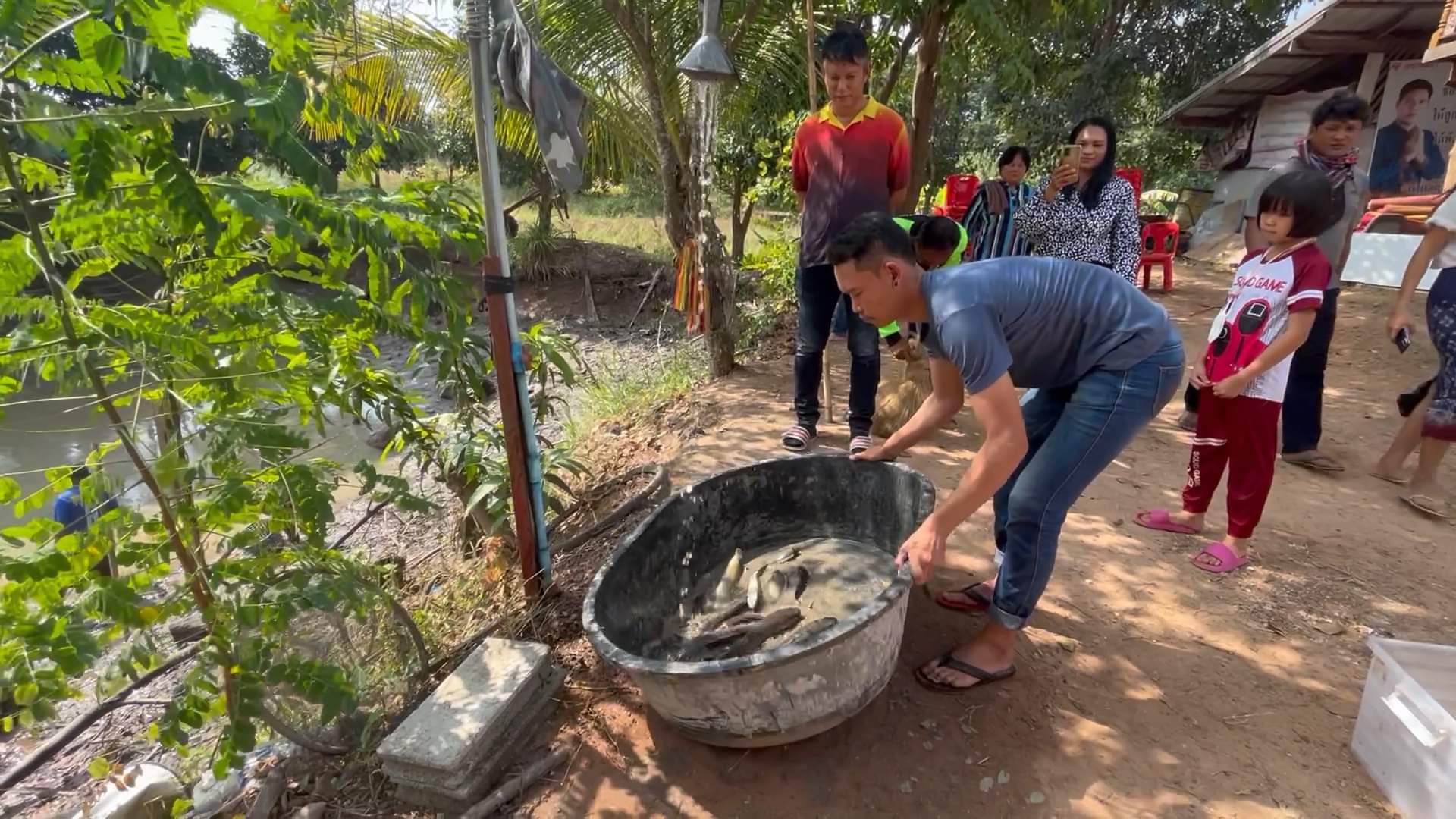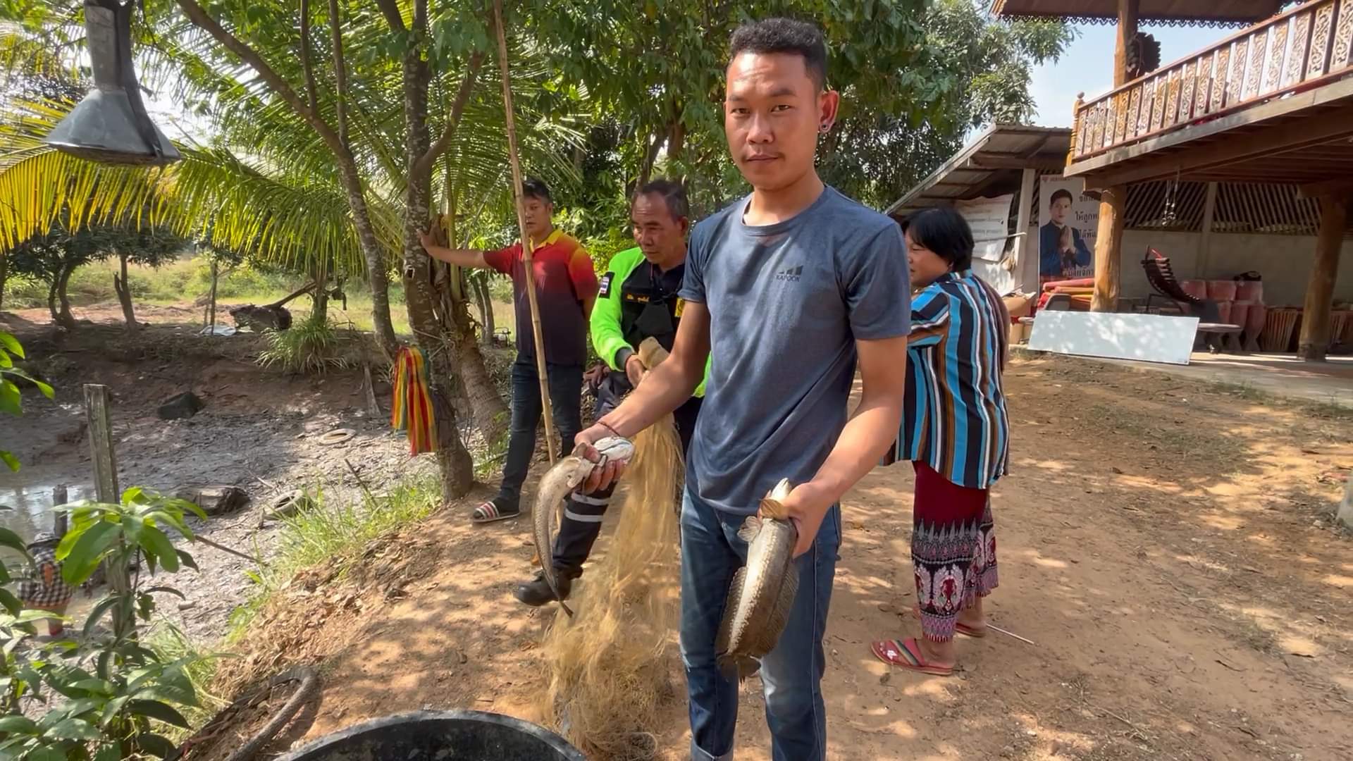 “ เมื่อน้ำที่สูบออกจากบ่อบสงส่วนจะลงสู่ทุ่งนา ซึ่งก็จะมีการบ่มดินอละเตรียมไถกลบและเตรียมทำนาปรังในช่วงเดือน ม.ค. และน้ำบางส่วนก็จะถูกสูบไปไว้ในอีกบ่อ 1 ที่อยู่ใกล้กันตามแผนการหมุนเวียนน้ำของชุมชน ซึ่งเมื่อน้ำใกล้แห้งเราก็จะเห็นปลาบ้อน หรือปลาที่อาศัยอยู่ในน้ำมาแหวกว่ายเล่นน้ำ ซึ่งถือเป้นเสน่ห์ชุมชนที่สวยงาม โดยกลุ่มแม่บ้านก็ช่วยกันจับปลา ที่อยู่ในน้ำหรือว่ายหลบหนีลงไปในโคลตม เด็กๆก็จะมาช่วยกันถือตระกร้าหรือเตรียมอุปกรณ์สำหรับการใส่ปลา ซึ่งปลาที่หาได้วันนี้ทั้งปลาหมอ ปลาช่อนและปลาไหล นอกจากจะนำมาประกอบอาหาเพื่อรับประทานร่วมกันแล้ว บางส่วนก็ยังคงมีการแจกจ่ายให้กับผู้ที่มาร่วมไถนาหรือมาร่วมลงแขกสูบน้ำจากบ่อ และบางส่วนได้นำไปมอบให้กับผู้ยากไร้ได้ประกอบอาหารรับประทานอีกด้วย”
