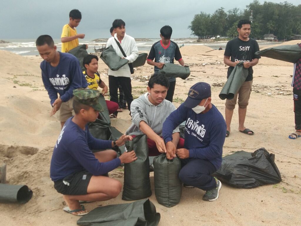 หน่วยเฉพาะกิจนาวิกโยธินกองทัพเรือ 33 ภายใต้การสั่งการโดย นาวาโท อำนาจ ภู่ทอง ผู้บังคับหน่วยฯ พร้อมด้วยกำลังพลนาวิกโยธินฯ และนักเรียนของโรงเรียนนราวิทย์อิสลามวิทยา ตำบลบางนาค อำเภอเมือง จังหวัดนราธิวาส ร่วมด้วยช่วยกันบรรจุทรายลงกระสอบ เพื่อเตรียมกระสอบทรายไว้ล่วงหน้า เนื่องจากสภาวะฝนที่ยังคงตกติดต่อกันเป็นเวลาหลายวันตั้งแต่วันที่ 8 ธันวาคม 2565 เป็นต้นมา เพื่อที่จะนำไปวางเป็นแนวกั้นน้ำที่จะทะลักเข้าท่วมอาคารเรียนของโรงเรียนนราวิทย์อิสลามวิทยา