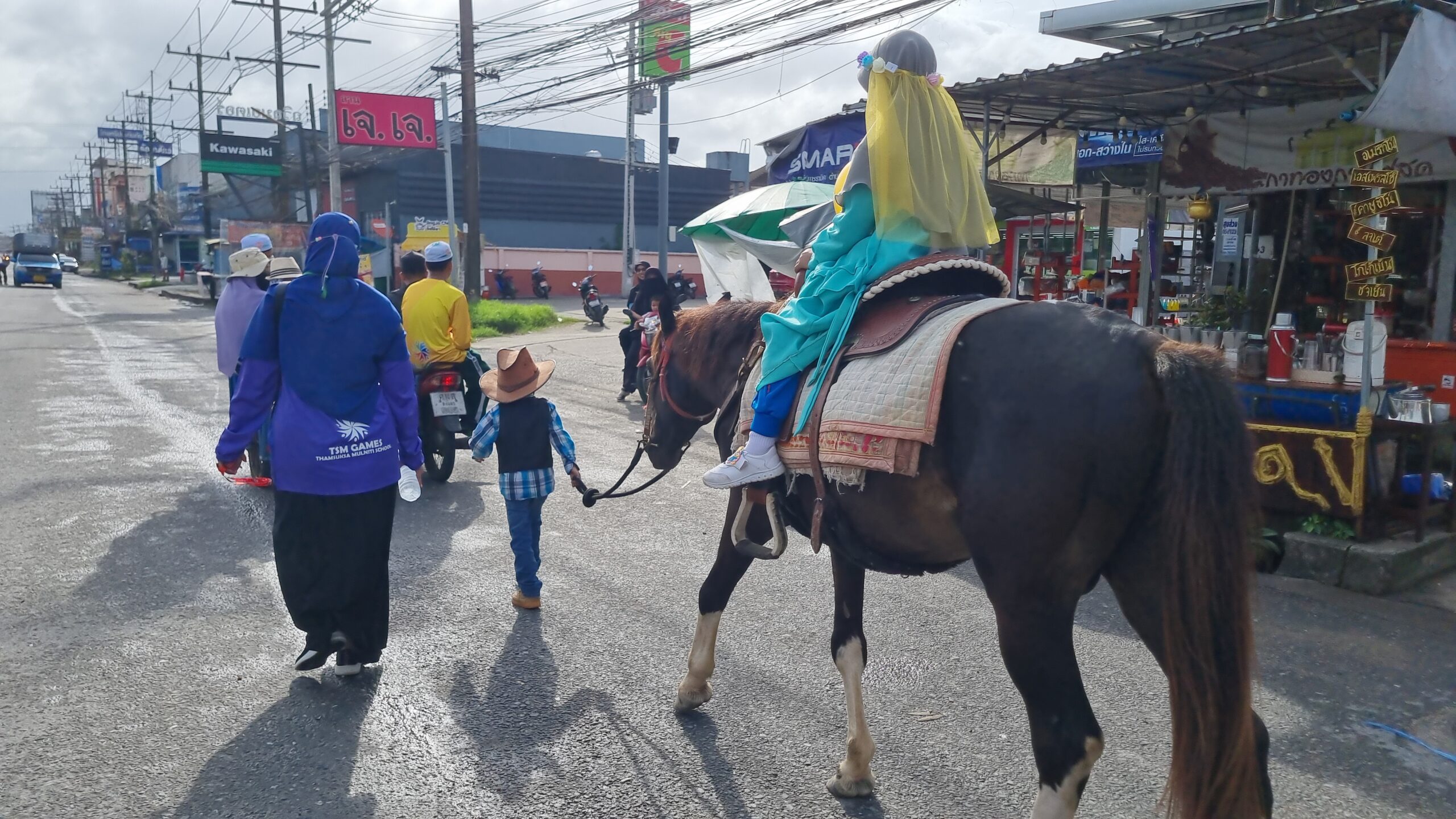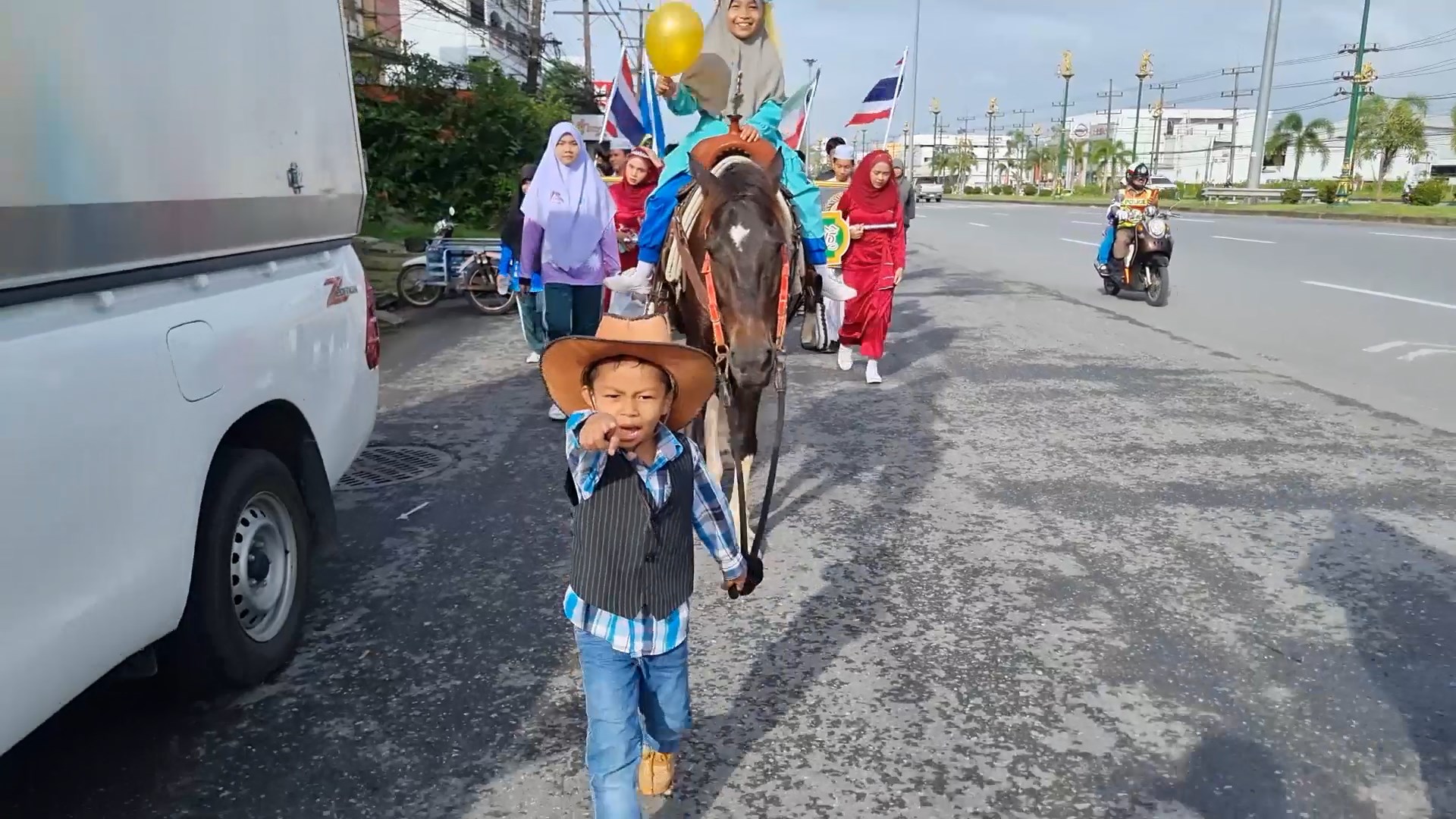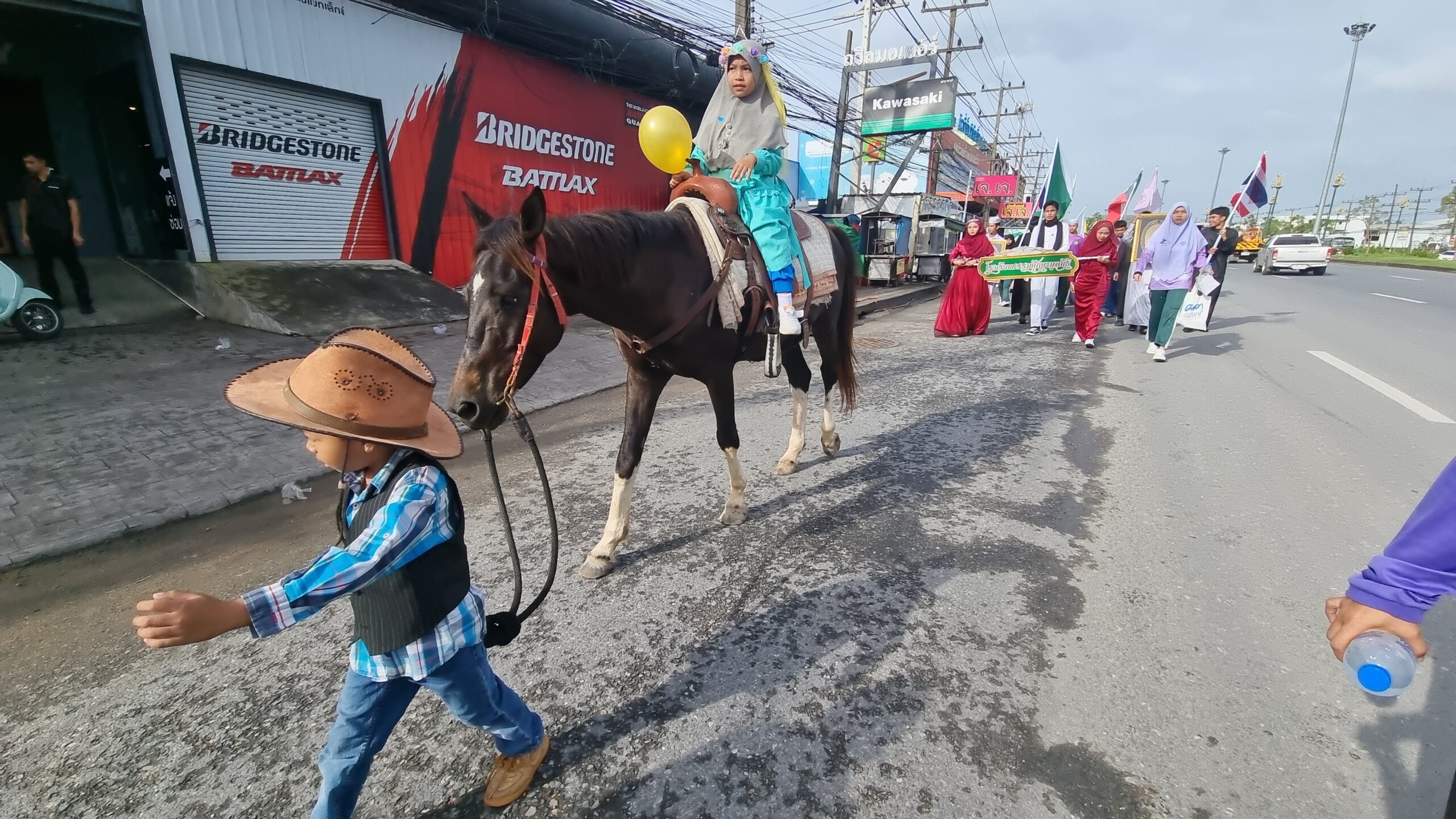 สำหรับคาวบอยน้อยของเราคนนี้ชื่อว่า ด.ช.กิสอุมัยรี ยังเรียนอยู่ชั้นอนุบาล ส่วนคาวเกิร์ลหรือคาวบอยหญิงที่นั่งบนหลังม้าคือ ด.ญ.หวันมุนีเร๊าะ อายุ 9 ปี พี่สาวซึ่งเรียนอยู่ชั้นป.3ที่ทั้งคาวบอยน้อยและคาวเกิร์ลสาวน้อยของเราสามารถจูงม้าและขี่ม้าได้อย่างชำนาญเพราะว่าที่บ้านเลี้ยงม้าและอยู่กับม้าตัวนี้มาตั้งแต่เด็กทั้งจูงและขี่เล่นเกือบทุกวัน วันนี้จึงได้นำม้ามาเดินนำหน้าขบวนพาเหรดของโรงเรียนเพื่อสร้างสีสัน ให้กับขบวนพาเหรด