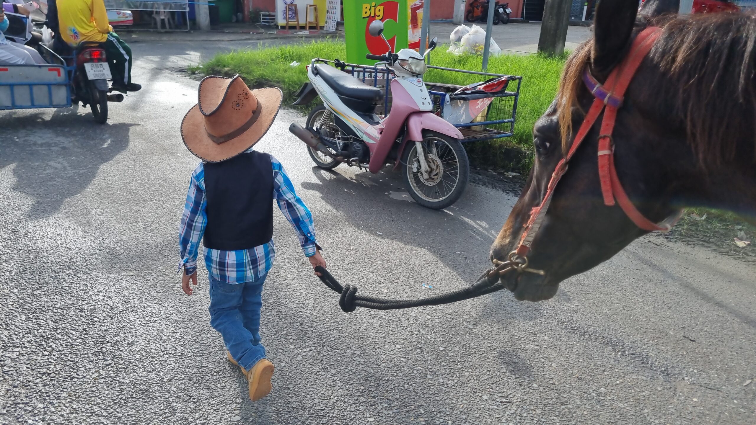 สีสันคาวบอยตัวน้อยอายุแค่5ขวบเดินจูงม้านำหน้าขบวนพาเหรดกีฬาสีโรงเรียน กลายเป็นจุดสนใจของผู้คนตลอดเส้นทาง