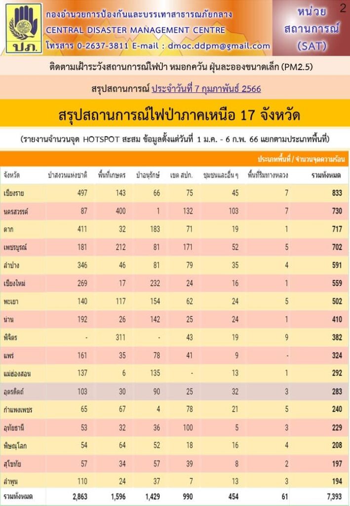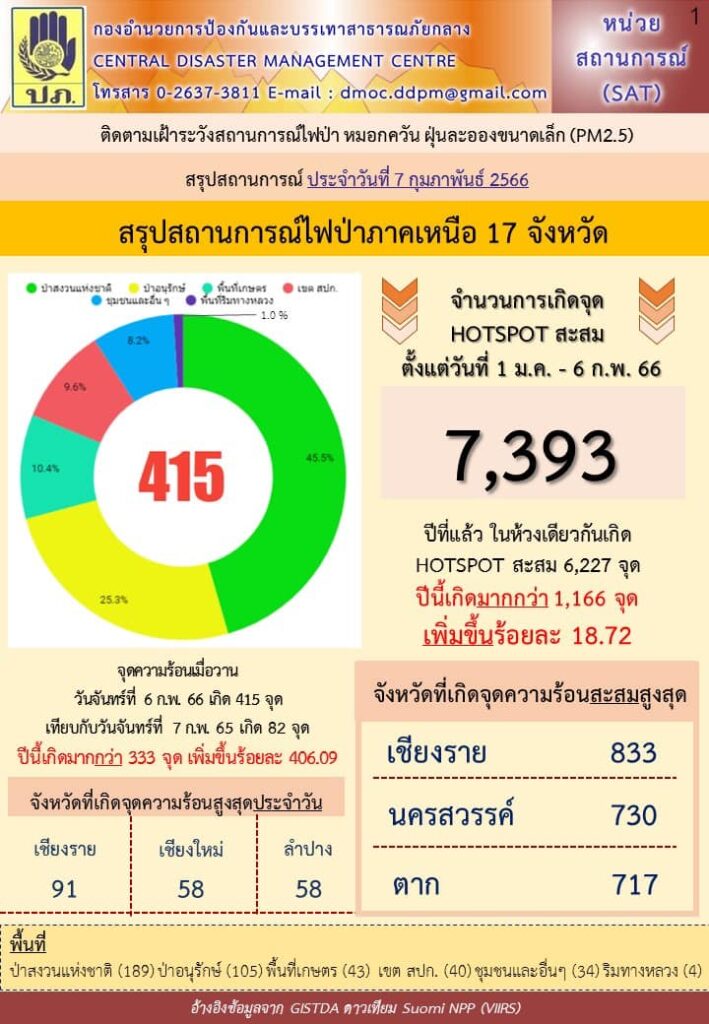 ปภ.ได้โพสต์ผ่านเพจเฟซบุ๊กสรุปสถานการณ์ไฟป่าภาคเหนือทั้ง17 จังหวัด พบว่าจำนวนการเกิดจุด Hotspot สะสมตั้งแต่วันที่1 ม.ค.-6 ก.พ.66 7,393 จุด ขณะปีที่แล้วในห้วงเดียวกัน Hotspot สะสม 6,227 จุด