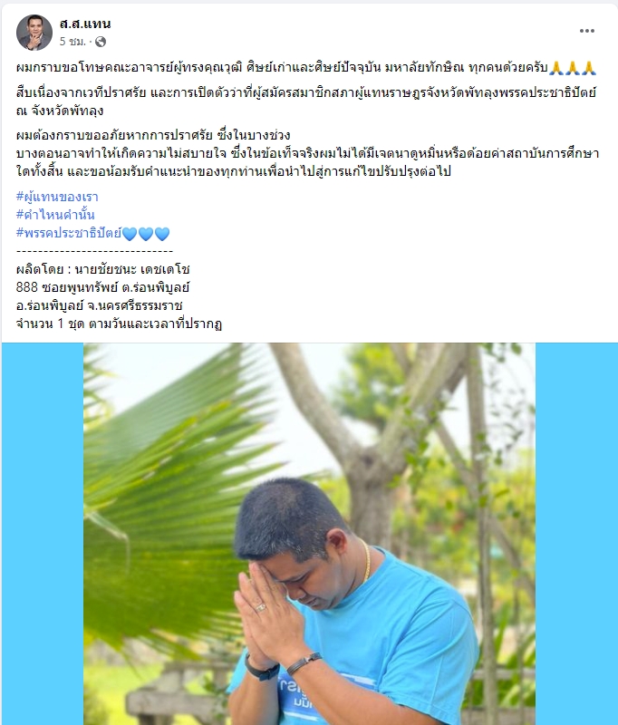 ส่วนทางด้านความเคลื่อนไหวของนายชัยชนะ เดชเดโช รองเลขาธิการพรรคประชาธิปัตย์ ได้โพสท์ข้อความเพจ ส.ส.แทน พร้อมภาพตัวเองกำลังยกมือไหว้อย่างนอบน้อม พร้อมข้อความว่า “ผมกราบขอโทษคณะอาจารย์ผู้ทรงคุณวุฒิ ศิษย์เก่าและศิษย์ปัจจุบัน มหาลัยทักษิณ ทุกคนด้วยครับ สืบเนื่องจากเวทีปราศรัย และการเปิดตัวว่าที่ผู้สมัครสมาชิกสภาผู้แทนราษฎรจังหวัดพัทลุงพรรคประชาธิปัตย์ ณ จังหวัดพัทลุง