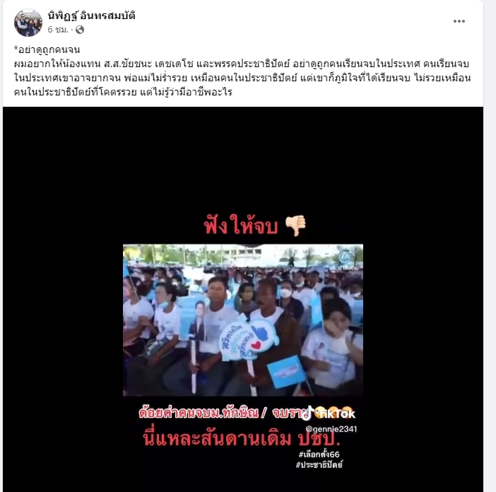 โดยช่วงเช้าที่ผ่านมา นายนิพิฎฐ์ อินทรสมบัติ อดีต สส.หลายสมัยของจังหวัดพัทลุง ได้นำคลิปที่มีการแชร์อย่างกว้างขวาง โพสท์ใน FB ส่วนตัวพร้อมทั้งข้อความระบุว่า “อย่าดูถูกคนจนผมอยากให้น้องแทน ส.ส.ชัยชนะ เดชเดโช และพรรคประชาธิปัตย์ อย่าดูถูกคนเรียนจบในประเทศ คนเรียนจบในประเทศเขาอาจยากจน พ่อแม่ไม่ร่ำรวย เหมือนคนในประชาธิปัตย์ แต่เขาก็ภูมิใจที่ได้เรียนจบ ไม่รวยเหมือนคนในประชาธิปัตย์ที่โคตรรวย แต่ไม่รู้ว่ามีอาชีพอะไร”