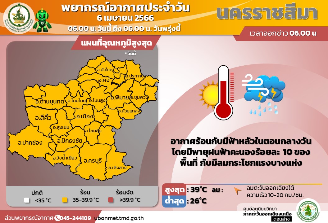 สถานีอุตุนิยมวิทยานครราชสีมา ได้พยากรณ์ลักษณะอากาศในวันนี้ว่า ตั้งแต่เวลา 06.00 น.วันนี้ ถึง 06.00 น.วันพรุ่งนี้ จังหวัดนครราชสีมาจะมีอากาศร้อนกับมีฟ้าหลัวในตอนกลางวันโดยมีพายุฝนฟ้าคะนอง ร้อยละ 10 – 40 ของพื้นที่ กับมีลมกระโชกแรงบางแห่ง โดยอุณหภูมิสูงสุดเมื่อวานนี้(5 เมษายน 2566) อยู่ที่ 39 องศาเซลเซียส และคาดการณ์ว่าวันนี้อุณหภูมิจะลดลง เนื่องจากมีพายุฝนฟ้าคะนองในบางจุดของจังหวัด ทำให้สภาพอากาศเย็นลง โดยอุณหภูมิสูงสุดจะอยู่ที่ 38 องศาเซลเซียส