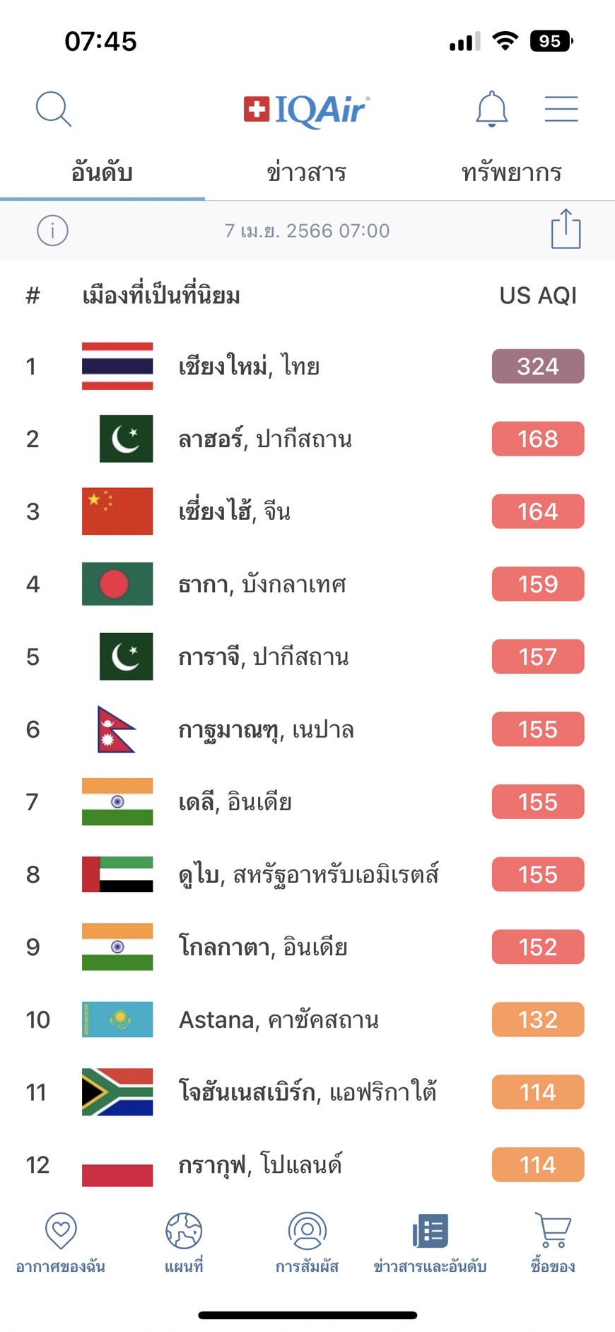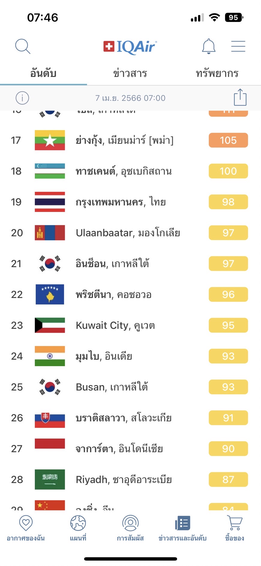 ส่วนกรุงเทพมหานคร,ไทย นั้นอยู่อันดับที่19 AQI 98
